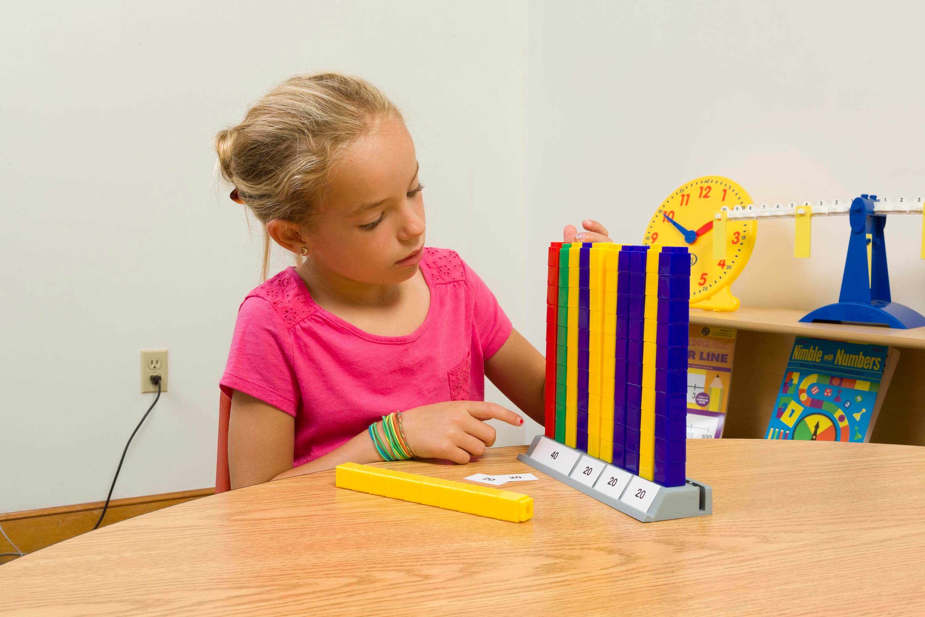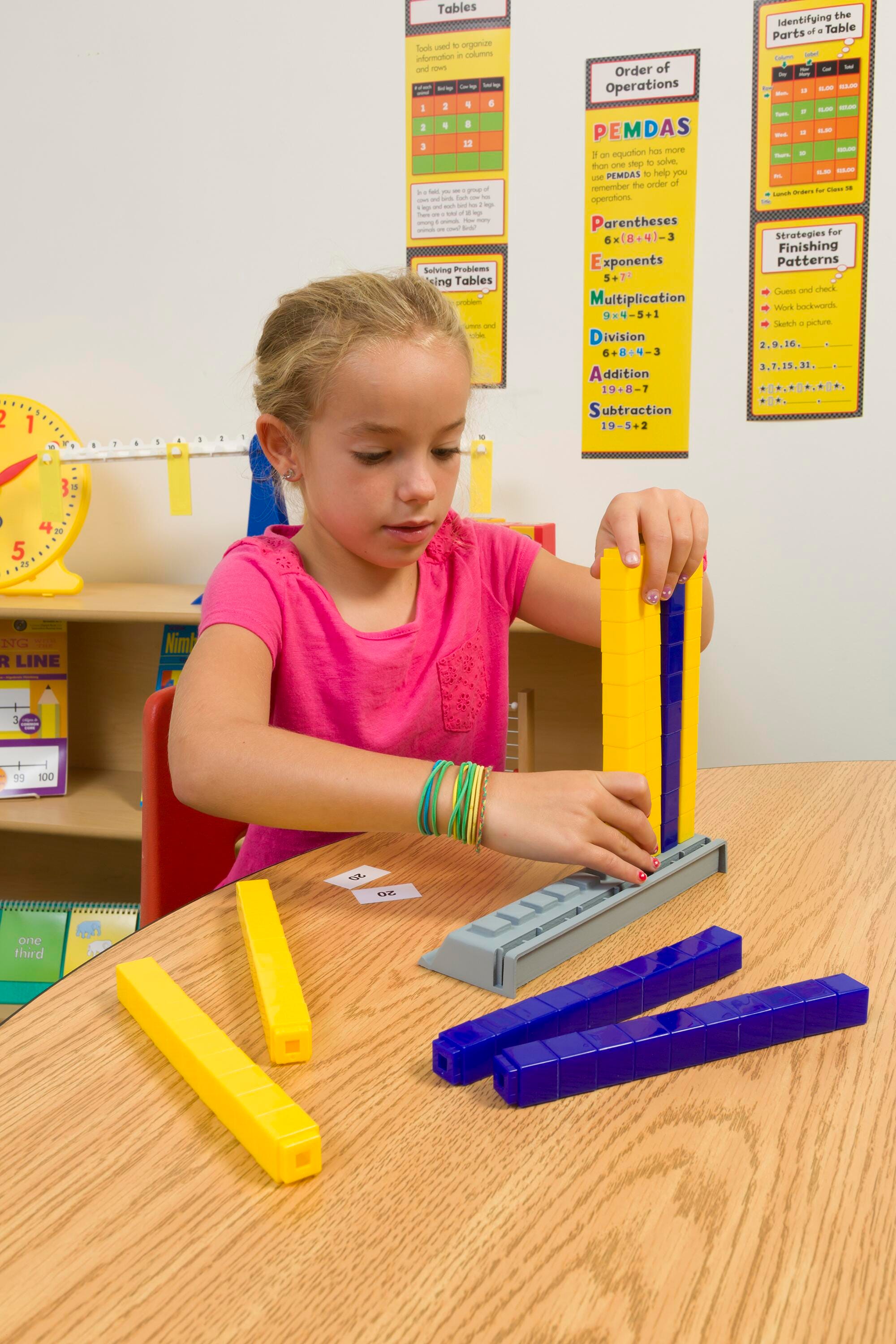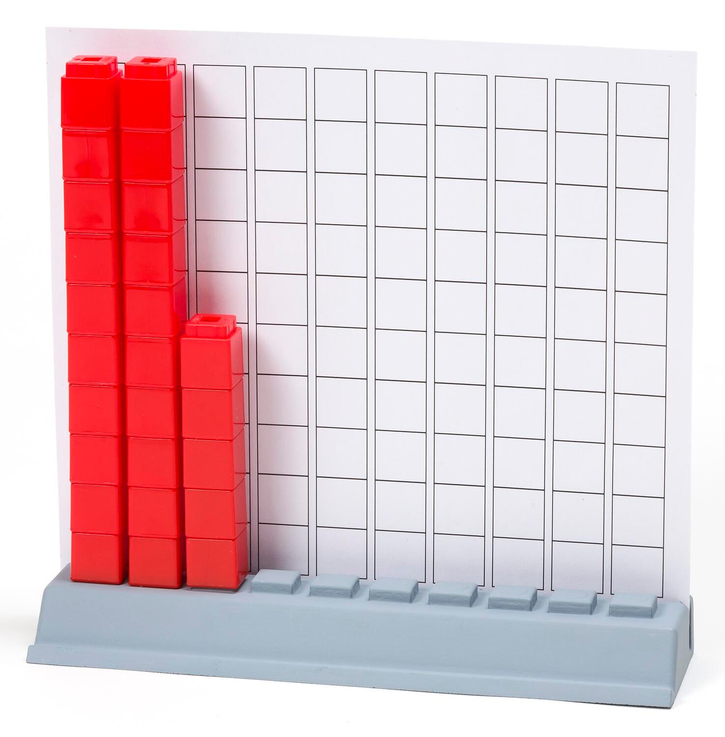 Use this versatile tool and Unifix Cubes to model and understand number concepts, base ten, and operations through 100. Comprehensive teacher's guide includes illustrated activities for number relationships, addition, subtraction, multiplication, and division. Base is 3 x 9 inches with 10 positions, and includes 22 number label cards (10s, 20s, 30s, 40s, 50s) and 100-grid card to position behind stacks of cubes. Unifix Cubes are sold separately.