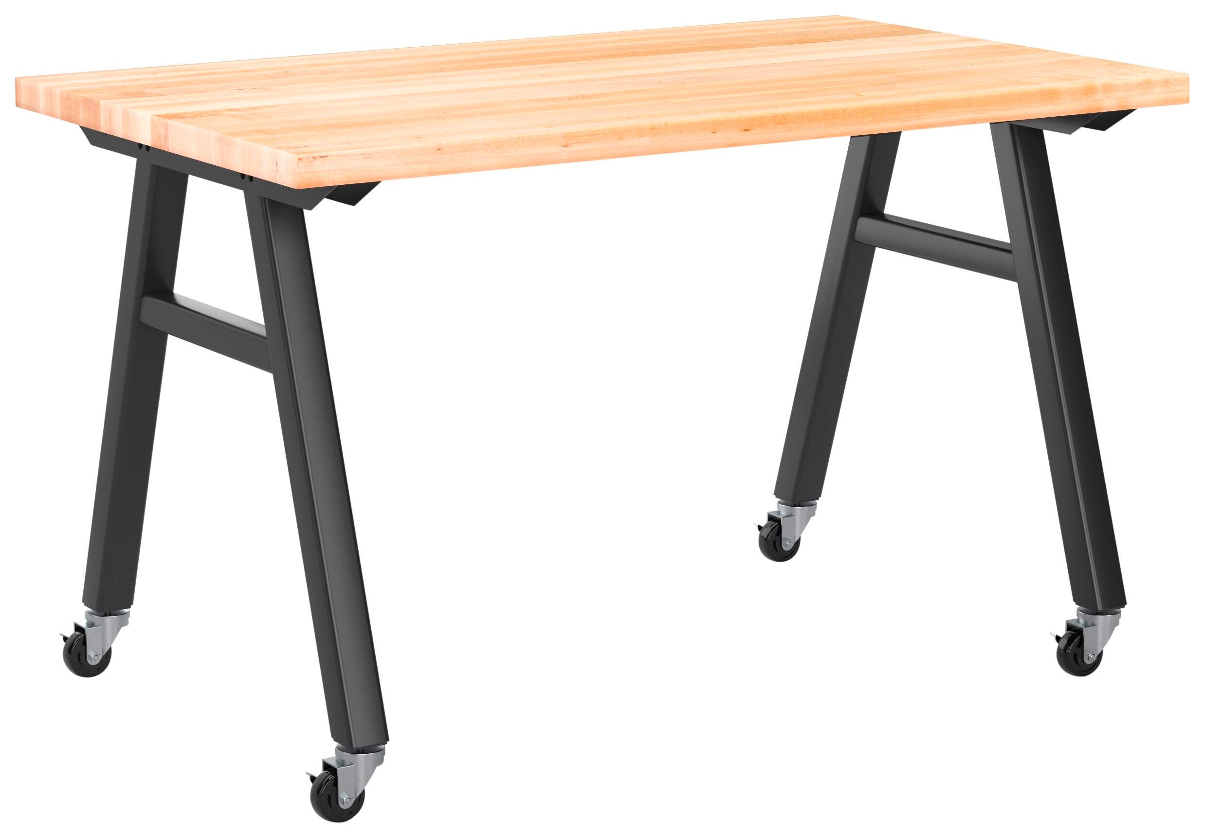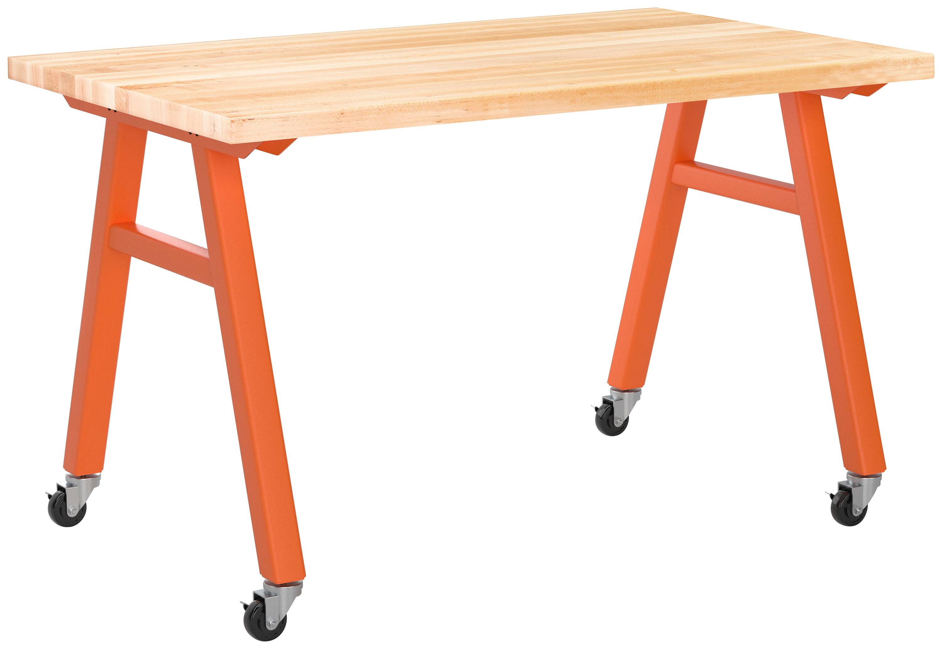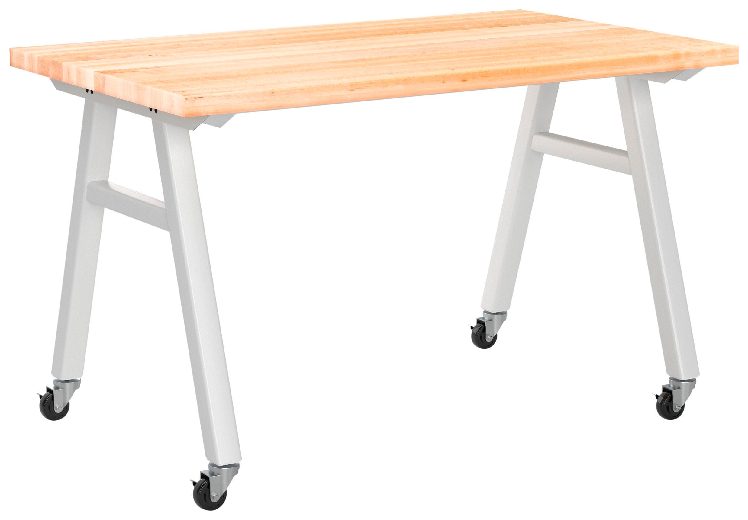 The Diversified Spaces Avenuu A-Frame Table brings an element of style to any space. The natural maple butcher block top is supported by a heavy gauge metal frame with full tube leg construction and dual cross-top supports. Four locking swivel casters allow easy mobility to any classroom or working environment.