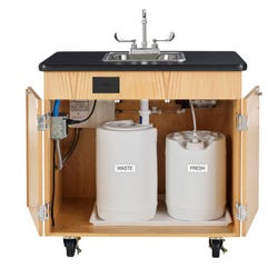 Need hot water, but there is no plumbing close? This hot water stations provides the ability to move to any location and still have access to hot water. The oak veneer cabinet features a water heater and water pump providing you with a hot or cold water. Water tanks: 5 gallon fresh water tank and 6 gallon waste water tank. We recommend starting with room temperature water in the fresh water tank to get the maximum use of the water heater. The mobile sink has a stainless steel sink, a hot and cold water mixing faucet and a duplex outlet. It comes with an extension cord and has an outlet. Water heats up to 10 to 15 degrees warmer than the fresh tank temperature. Unit rolls easily on 4 inch locking swivel casters.