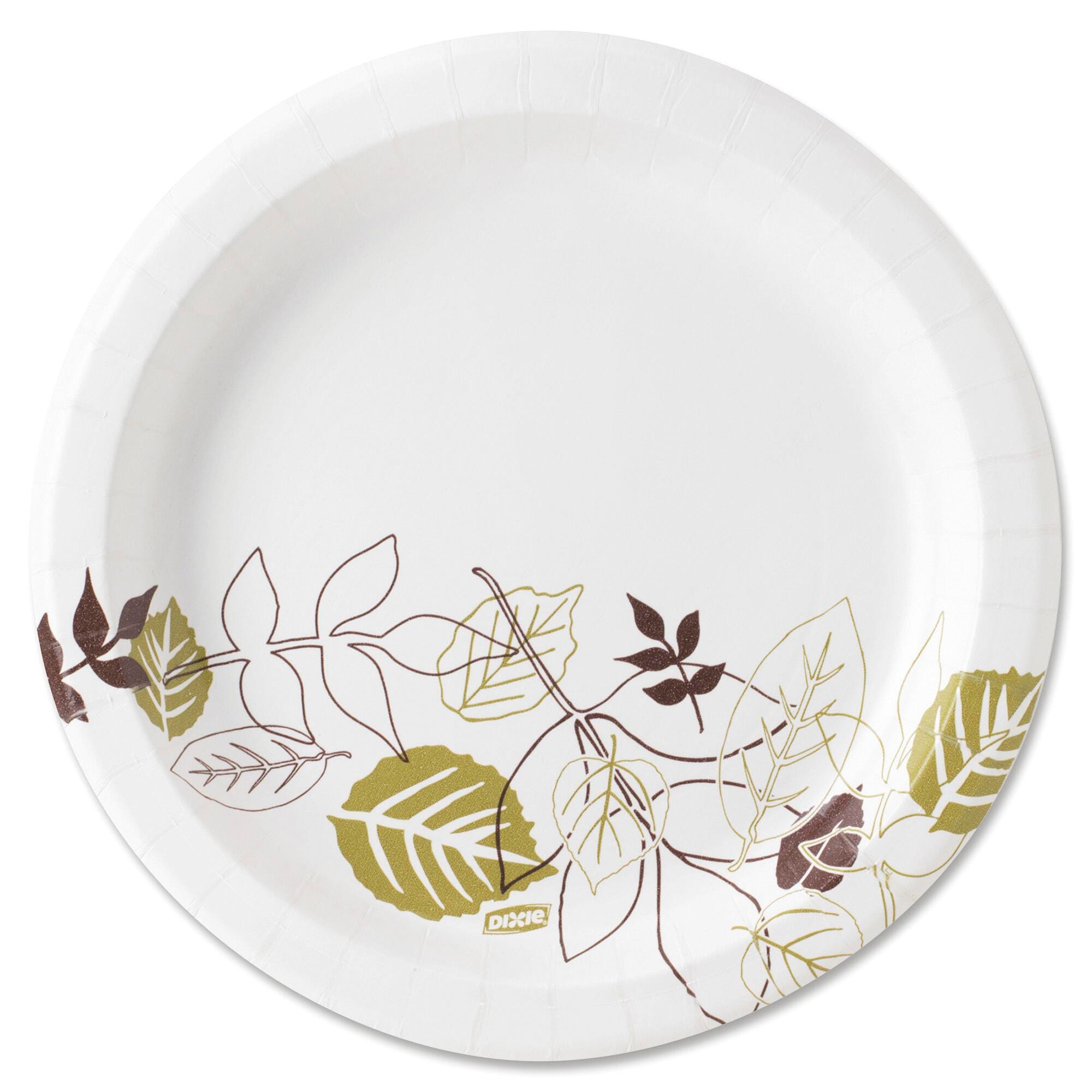 Dixie Foods White Medium Paper Plate renders moisture resistance, grease resistance, dry and wet rigidity. The plate is engineered with a 5-layer design. It has a soak-proof shield that provides strength and rigidity for all kinds of foods. A plate with an upscale yet down-to-earth nature theme complements food. Pathways design renders a crisp white background for a clean look and a falling leaf pattern in natural, contemporary colors. Sold as 1000 per pack.Features