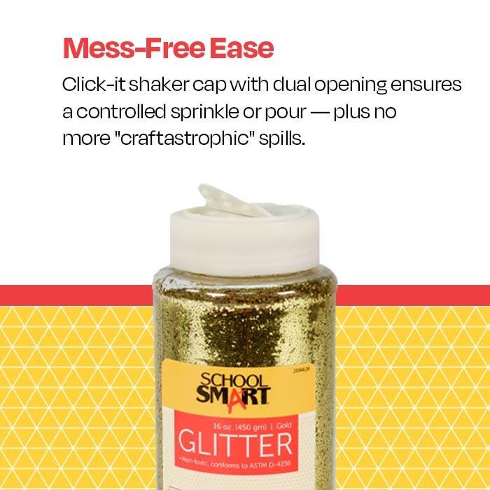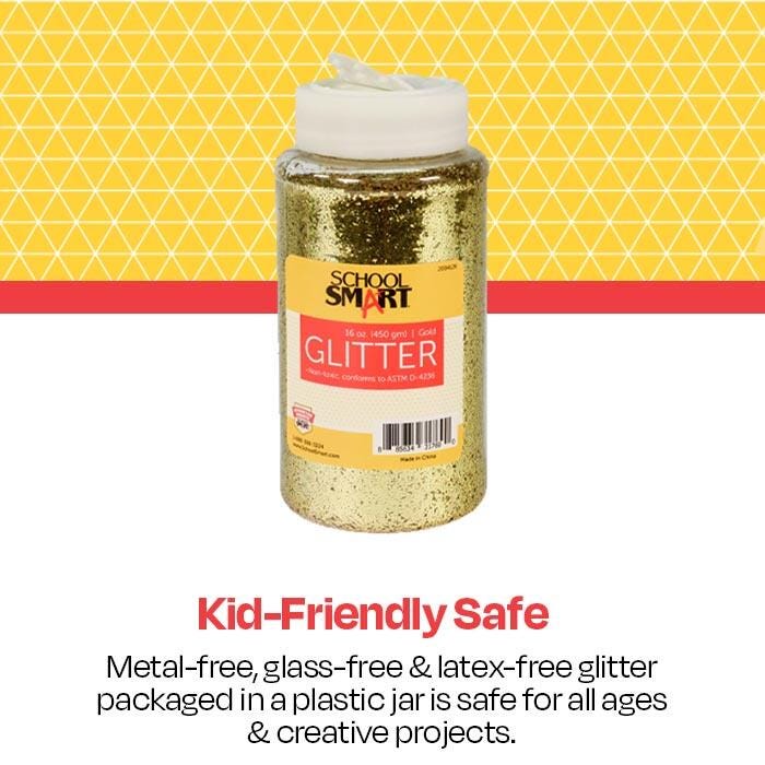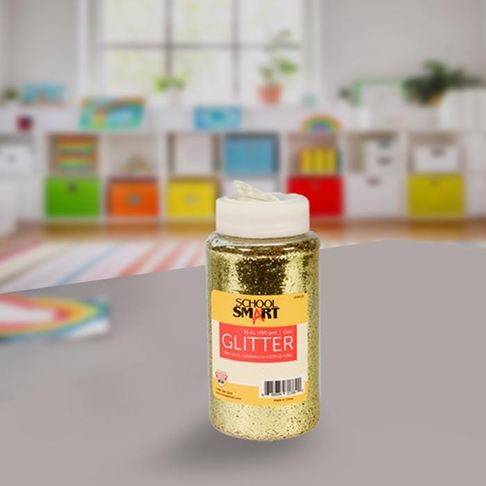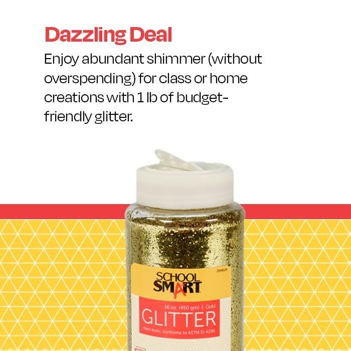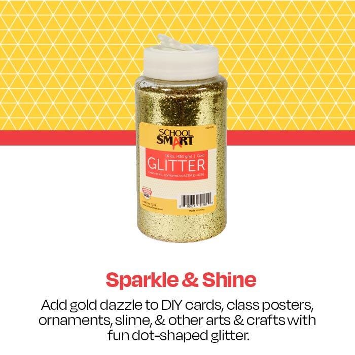 School Smart Gold Craft Glitter is made with tiny shimmering flakes that add sparkle to candles, displays, craft projects, costumes, artwork, or any party. It is easy to use by just spraying or brushing adhesives on a surface and then sprinkling colorful glitter from the handy shaker container to make attractive craft projects. Glitter is non-toxic and perfect to use for cards, ornaments, candles, collages, and much more. The container features a click-it, shaker cap to help prevent a "craftastrophe" (You know the type). 1 Pound Jar.