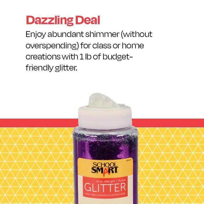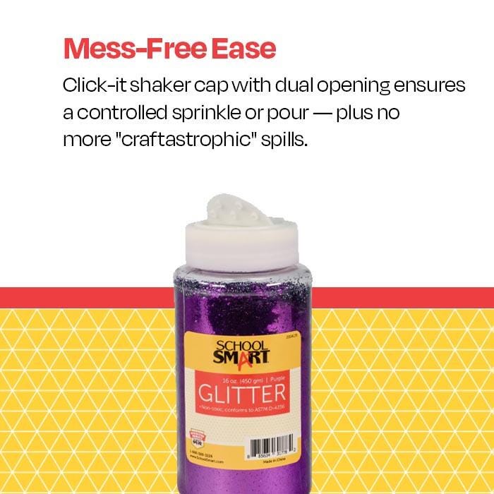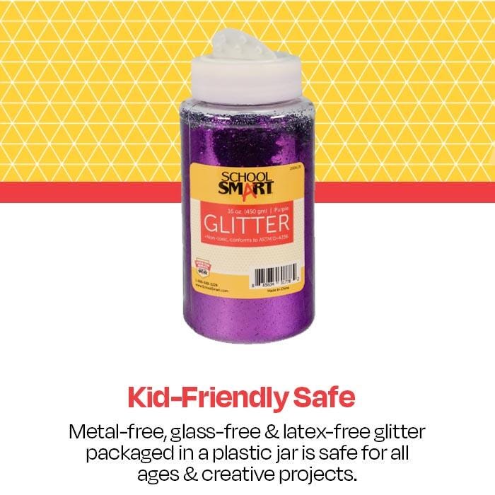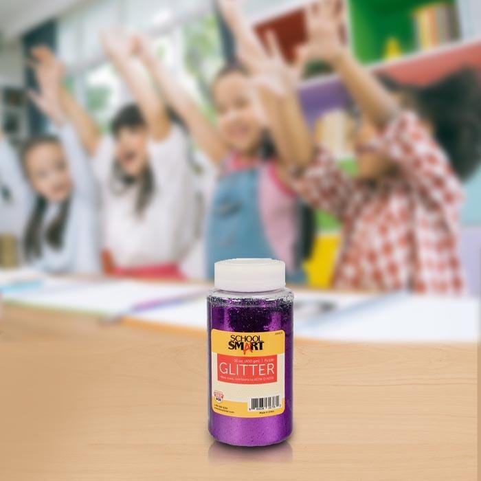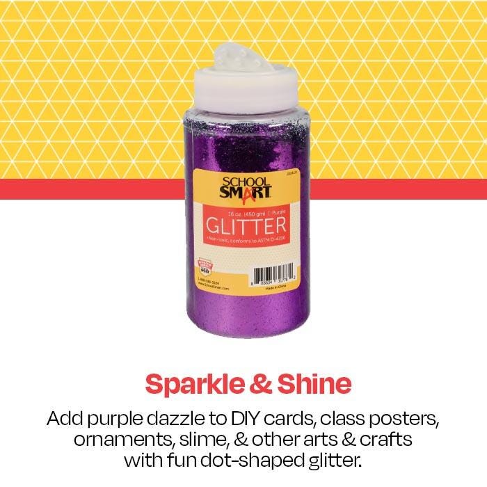 School Smart Purple Craft Glitter is made with tiny shimmering flakes that add sparkle to candles, displays, craft projects, costumes, artwork, or any party. It is easy to use by just spraying or brushing adhesives on a surface and then sprinkling colorful glitter from the handy shaker container to make attractive craft projects. Glitter is non-toxic and perfect to use for cards, ornaments, candles, collages, and much more. The container features a click-it, shaker cap to help prevent a "craftastrophe" (You know the type). 1 pound jar of purple glitter.