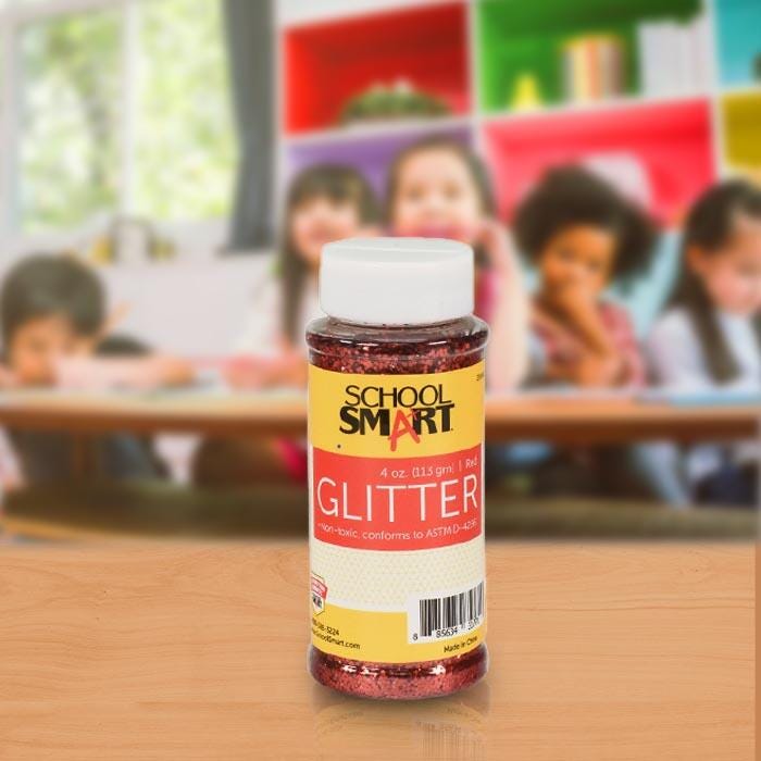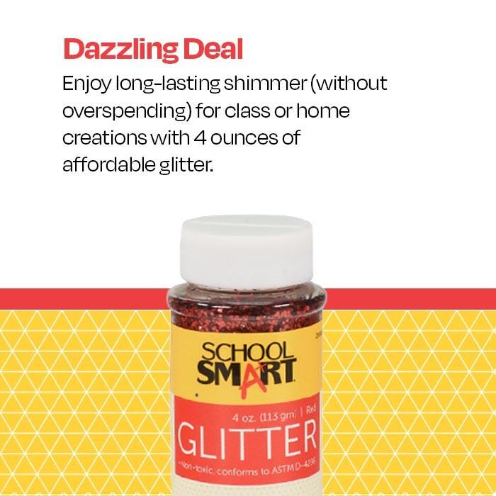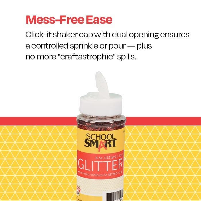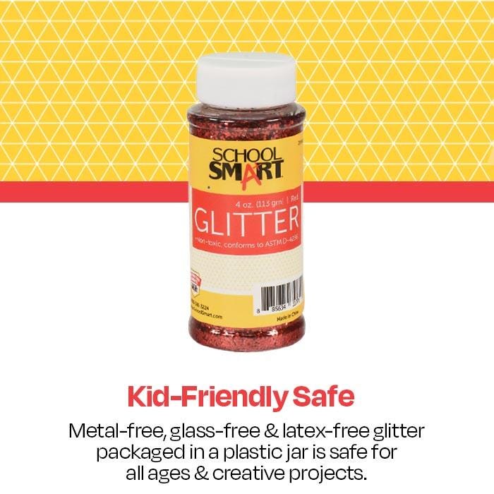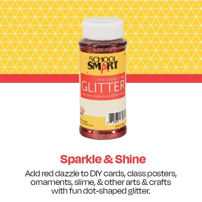 School Smart Red Craft Glitter is made with tiny shimmering flakes that add sparkle to candles, displays, craft projects, costumes, artwork, or any party. It is easy to use by just spraying or brushing adhesives on a surface and then sprinkling colorful glitter from the handy shaker container to make attractive craft projects. Glitter is non-toxic and perfect to use for cards, ornaments, candles, collages, and much more. The container features a click-it, shaker cap to help prevent a "craftastrophe" (You know the type). 4-ounce container.