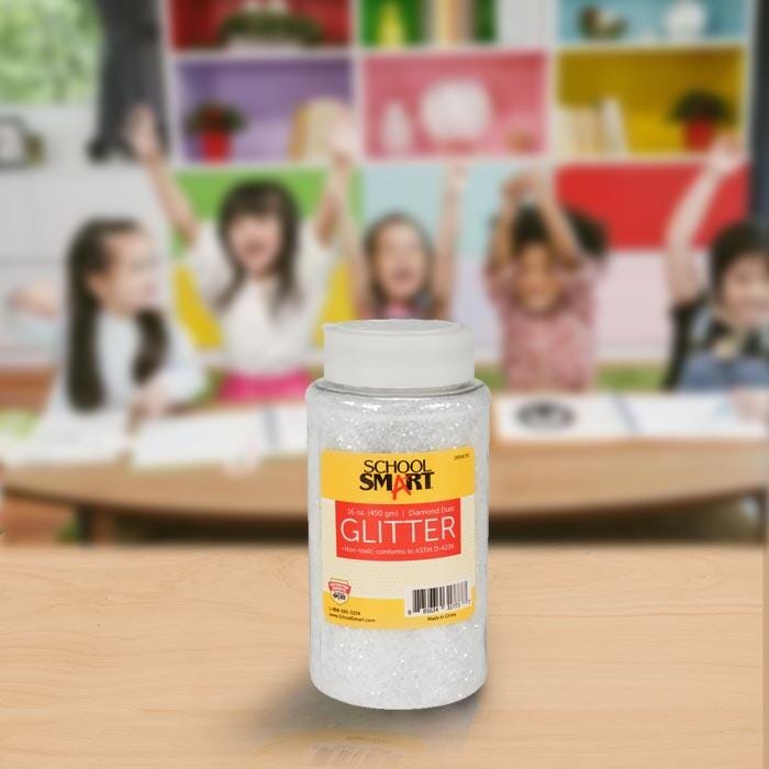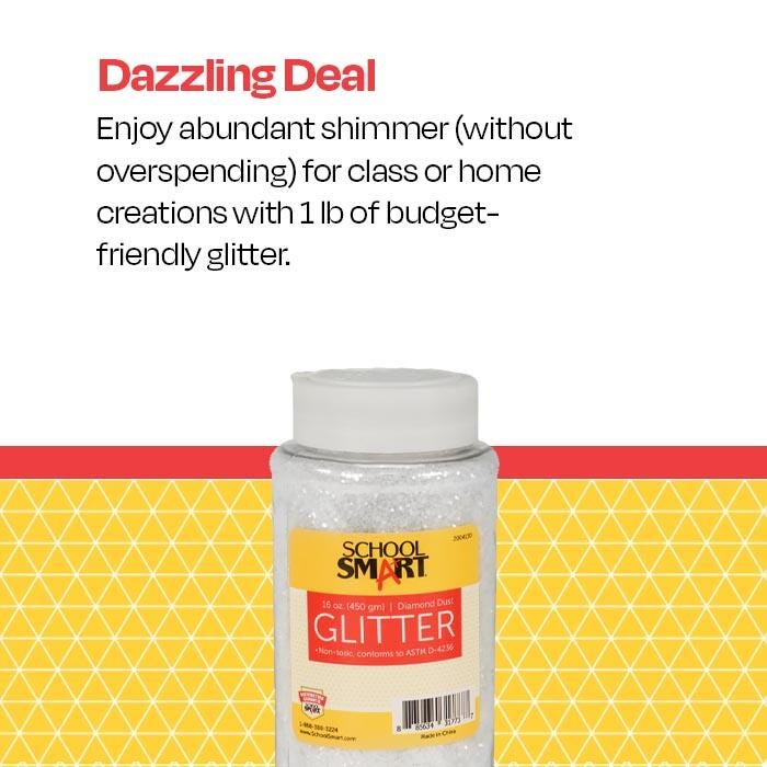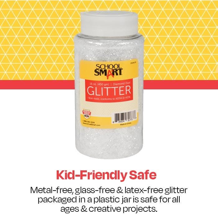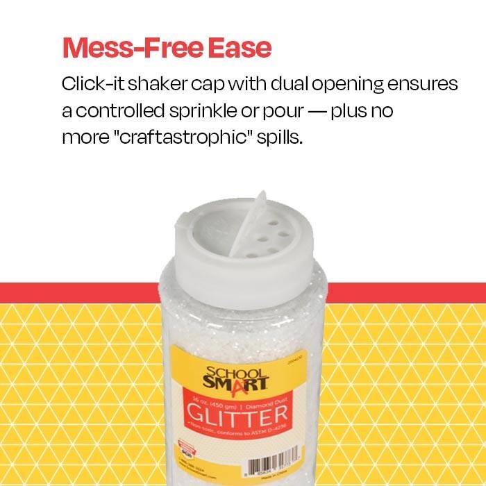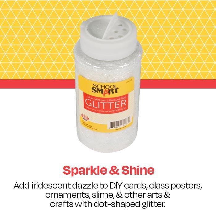 School Smart Diamond Craft Glitter is made with tiny shimmering flakes that add sparkle to candles, displays, craft projects, costumes, artwork, or any party. It is easy to use by just spraying or brushing adhesives on a surface and then sprinkling colorful glitter from the handy shaker container to make attractive craft projects. Glitter is non-toxic and perfect to use for cards, ornaments, candles, collages, and much more. The container features a click-it, shaker cap to help prevent a "craftastrophe" (You know the type). 1 pound jar of glitter.