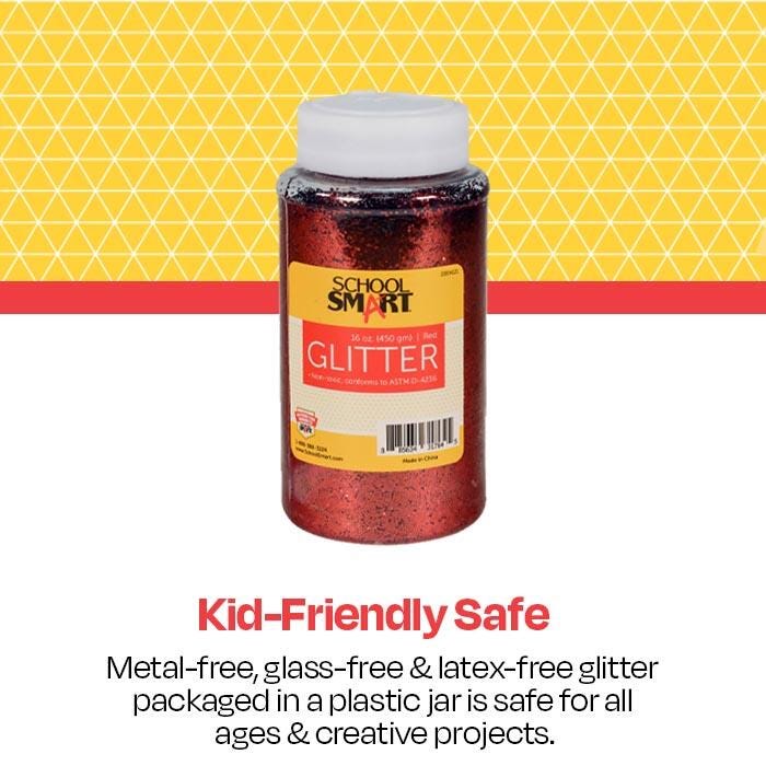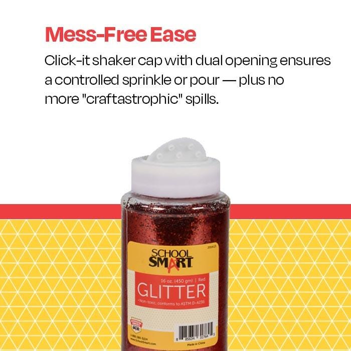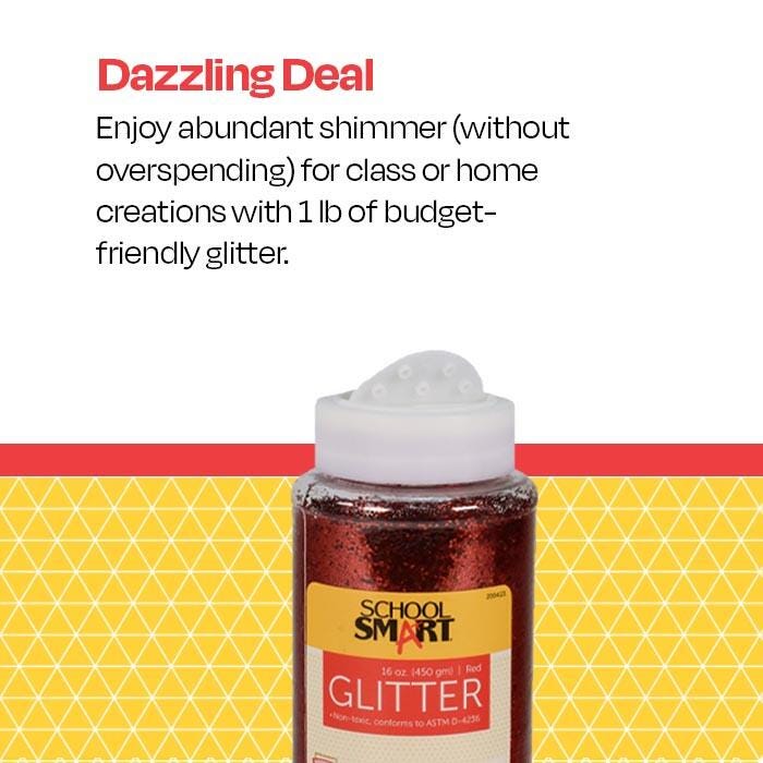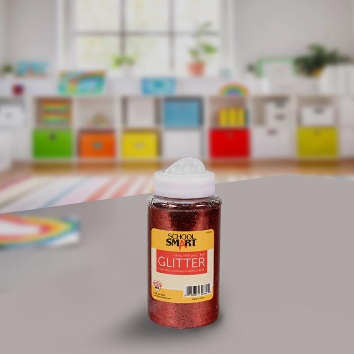 School Smart Red Craft Glitter is made with tiny shimmering flakes that add sparkle to candles, displays, craft projects, costumes, artwork, or any party. It is easy to use by just spraying or brushing adhesives on a surface and then sprinkling colorful glitter from the handy shaker container to make attractive craft projects. Glitter is non-toxic and perfect to use for cards, ornaments, candles, collages, and much more. The container features a click-it, shaker cap to help prevent a "craftastrophe" (You know the type). 1 pound jar of red glitter.