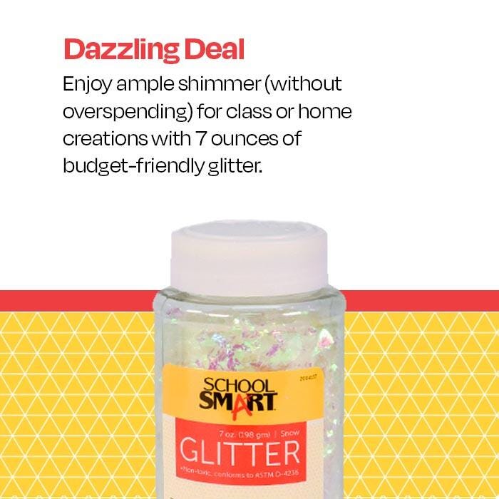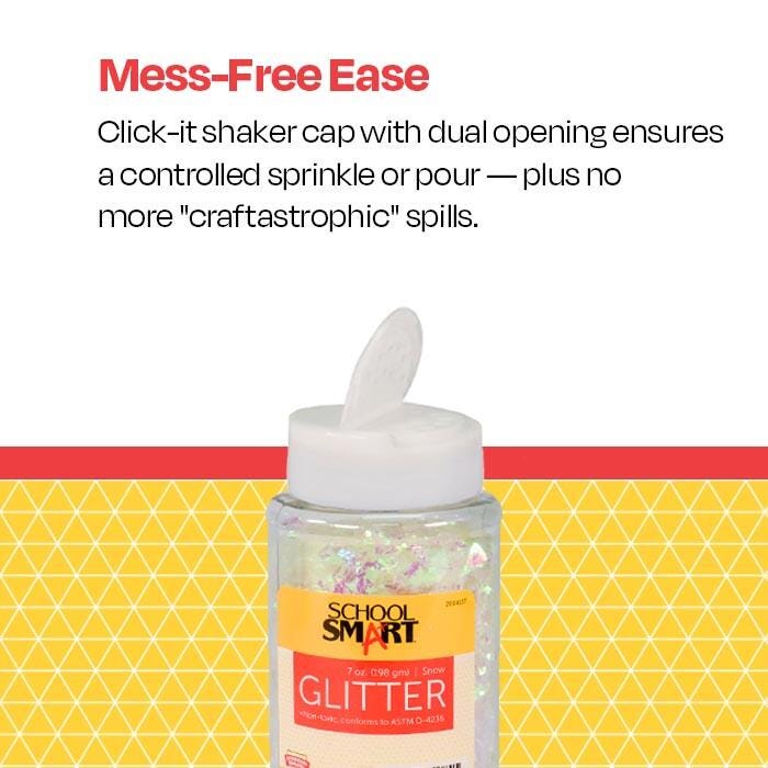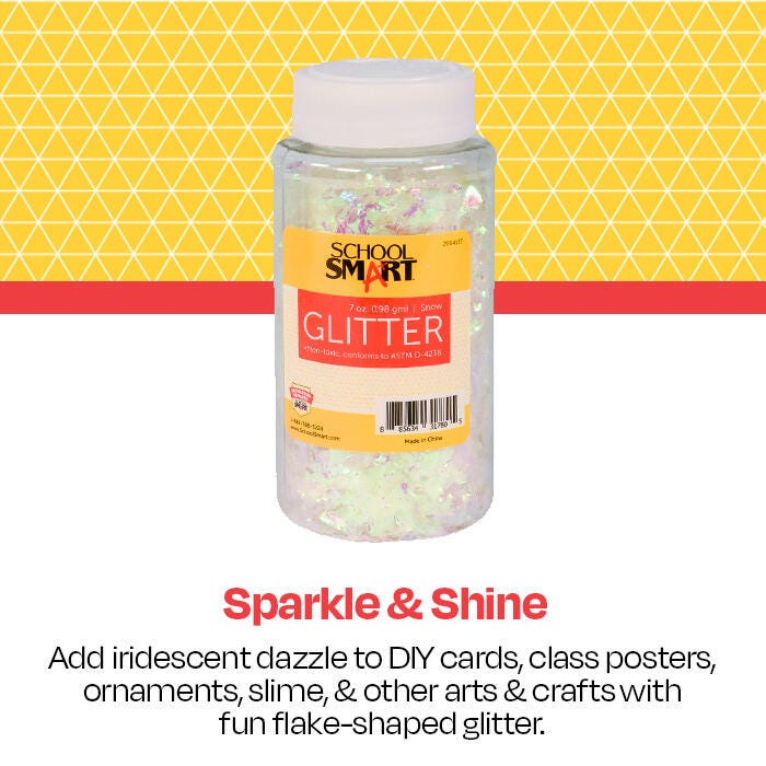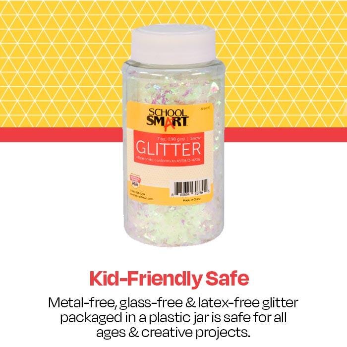 School Smart Snow Craft Glitter is made with tiny shimmering flakes that add sparkle to candles, displays, craft projects, costumes, artwork, or any party. It is easy to use by just spraying or brushing adhesives on a surface and then sprinkling colorful glitter from the handy shaker container to make attractive craft projects. Glitter is non-toxic and perfect to use for cards, ornaments, candles, collages, and much more. The container features a click-it, shaker cap to help prevent a "craftastrophe" (You know the type). 7-ounce container.