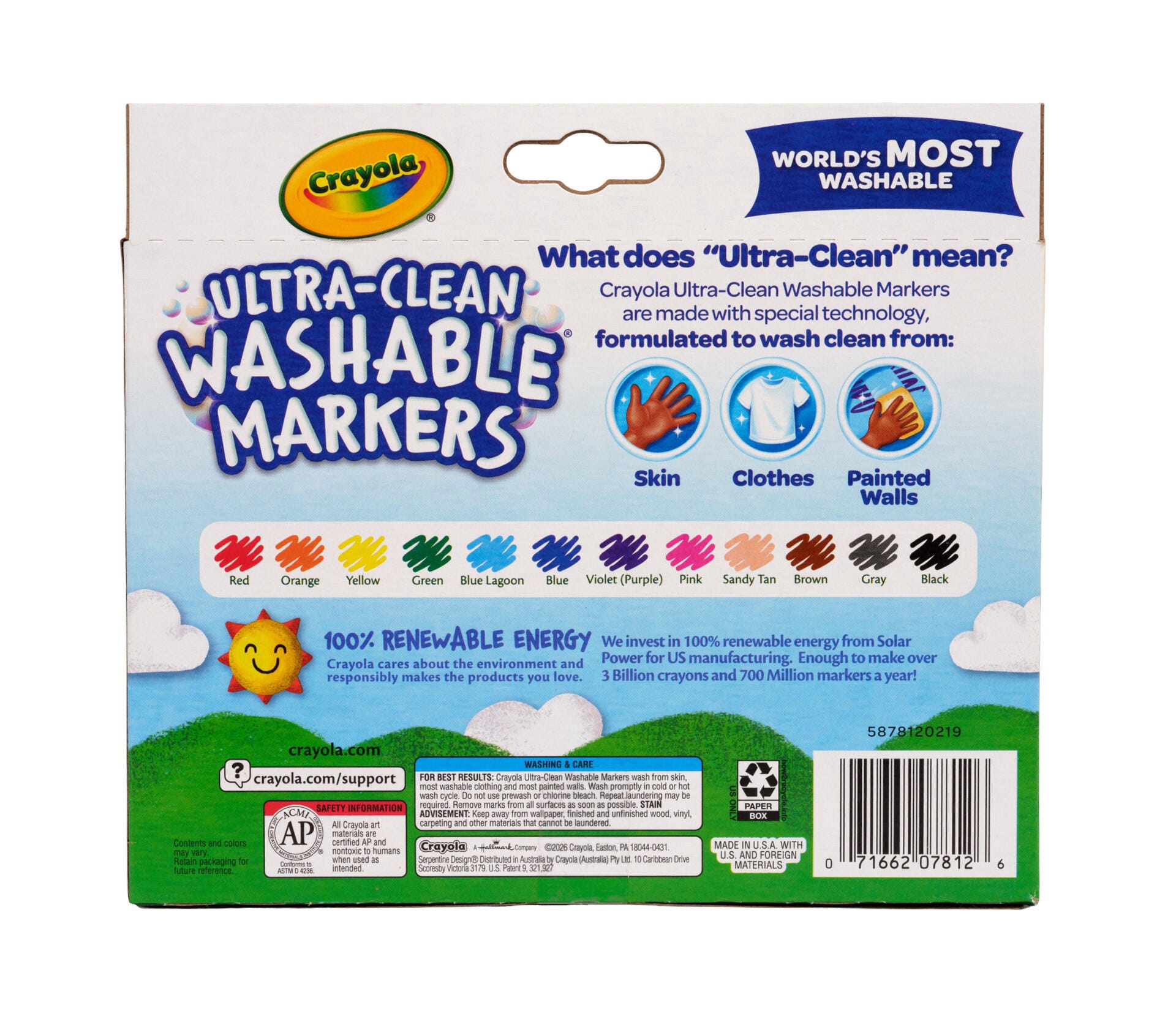 Bring home the most washable marker in the world! These Crayola Ultra-Clean Washable Markers have a broad-line conical tip that lays down wide strokes and thin lines for coloring, drawing, writing, and more. The Ultra-Clean formula keeps the colors where you want them, making it easy to wash stray marks from skin, clothing, and even walls. This set includes 12 markers, 1 each of the following colors: black, blue, brown, green, orange, red, violet, yellow, blue lagoon, dolphin gray, flamingo pink and sandy tanFeatures