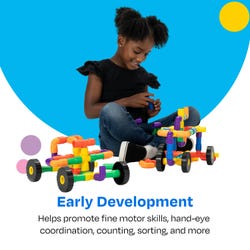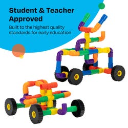 The Childcraft® Construction Pipes and Wheels Set is perfect for young builders to explore engineering, problem-solving, and spatial reasoning. Featuring various interlocking pipes, connectors, and wheels, this play set allows children to construct unique designs, vehicles, and structures with ease. Bright colors and multiple shape variations encourage open-ended play, while the included activity cards provide guided inspiration for young learners. A durable storage bin keeps all the manipulatives organized for easy cleanup, making this set a great addition to classrooms, childcare centers, and home learning spaces. Appropriate for ages 3+.Features