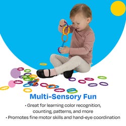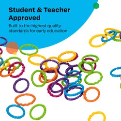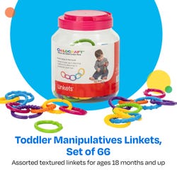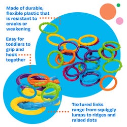 Childcraft® Toddler Manipulatives Linkets provide endless opportunities for sensory exploration and fine motor development. These easy-to-grip, textured links snap together to form chains, shapes, and creative designs. Designed for young learners, the durable, flexible plastic construction ensures safe and long-lasting use with a crack-resistant design. Whether used for stacking, linking, sorting, or hanging items, these versatile manipulatives support early problem-solving, color recognition, and hand-eye coordination. Perfect for classrooms, childcare centers, playrooms, and home learning environments, these plastic chain links make early learning engaging and fun.Features