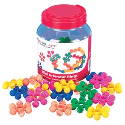 The Childcraft® Toddler Manipulatives Mini Interstar Rings offer a fun and engaging way for toddlers and young children to explore hands-on learning. These colorful, interlocking star shapes help build fine motor skills, hand-eye coordination, and problem-solving abilities. Designed for young learners, the chunky plastic manipulatives easily connect and pull apart, allowing for endless building possibilities. Ideal for early math and sorting activities, these durable manipulatives support cognitive and creative play. The included storage jar keeps play pieces organized and easily accessible.Features