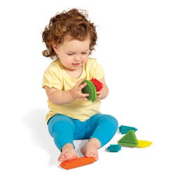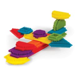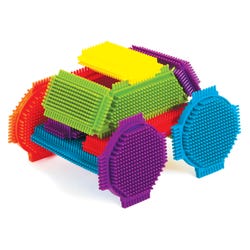 - The building set includes 18 soft, flexible bristle building pieces in assorted colors and shapes