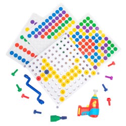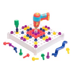 Construction fun with a creative twist! Children will have a blast using life-like plastic bolts, reversible power drill, screw driver, wrench and more to construct pictures onto the boards.
