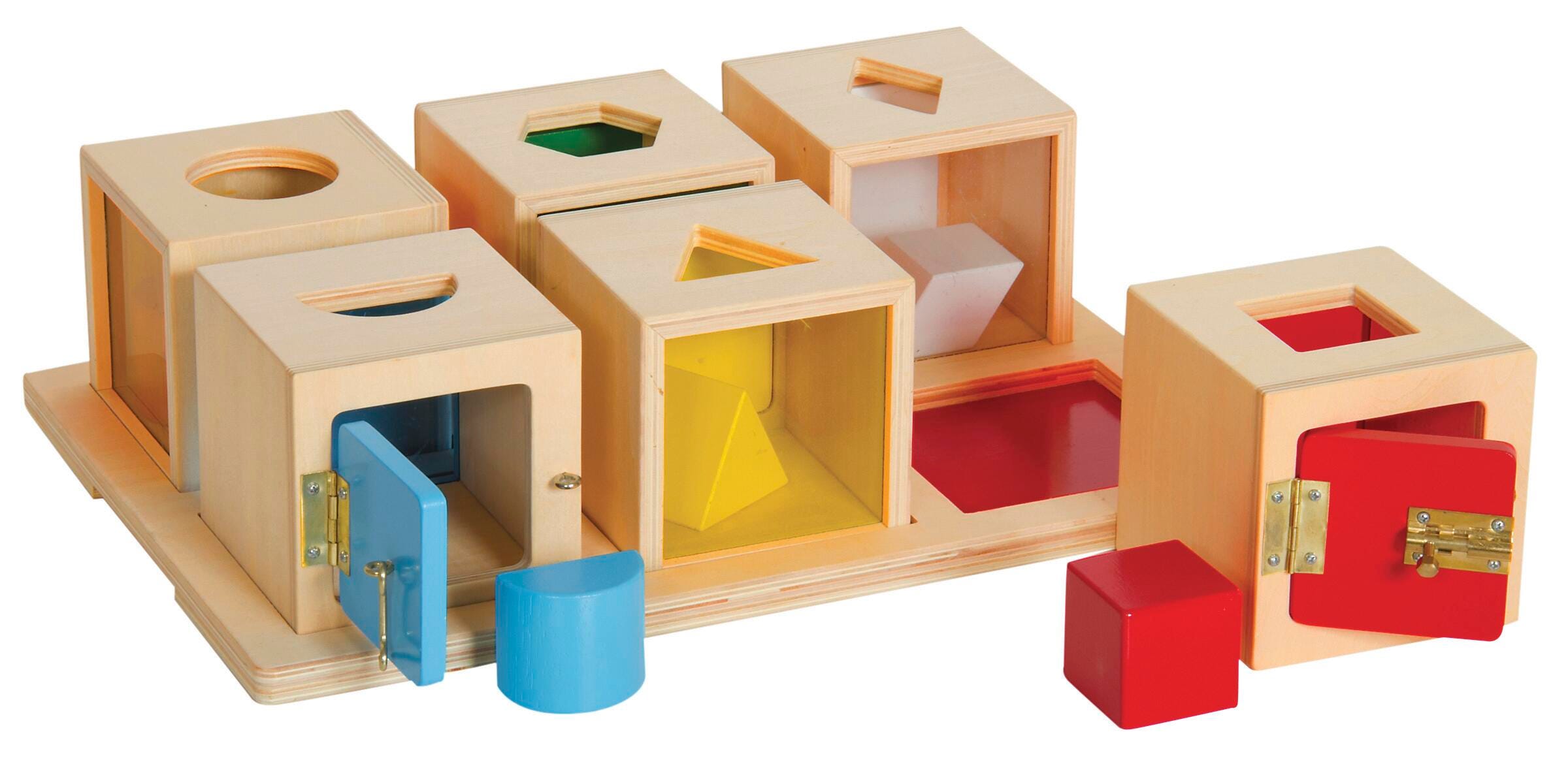 Unlock the box to reveal the colorful shape inside. These six boxes contain unique lock mechanisms to encourage problem-solving in young learners, designed with a peekaboo window to see what's inside. Includes six boxes with six shapes in varying colors.