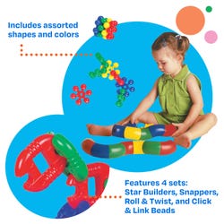 The Childcraft® Toddler Manipulatives Kit B provides hands-on exploration with four different sets of engaging manipulatives. Each set features colorful, easy-to-grasp pieces that snap, click, roll, and twist together, helping to strengthen hand-eye coordination, problem-solving skills, and early STEM concepts. Ideal for childcare centers, early learning classrooms, and home play, this learning manipulatives set offers endless creative possibilities. Includes a storage container for easy organization.Features