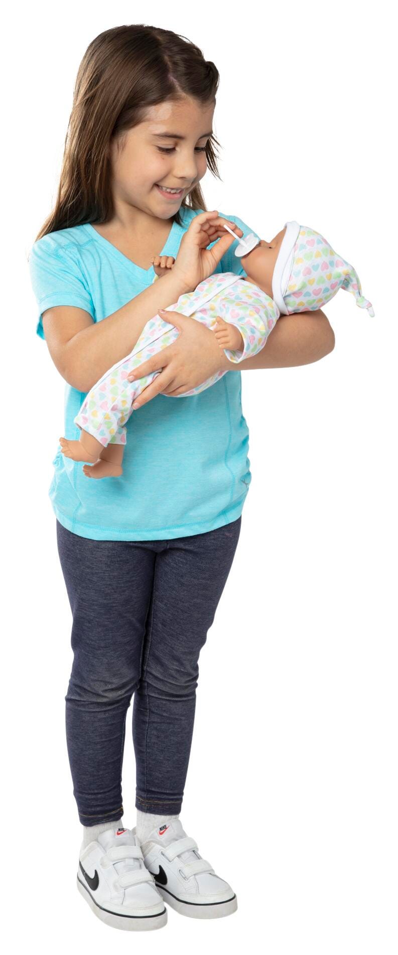 • Two 15-inch clothed boy and girl baby dolls with medium skin tone that can suck their thumbs or pacifiers