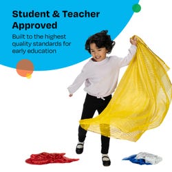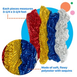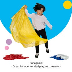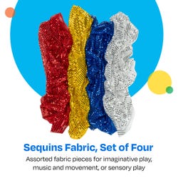 Childcraft® Sequins Fabric set is a versatile sensory tool that adds sparkle and encourages imaginative play, movement, and creative expression. This lightweight, soft, and sparkly fabric comes in the four colors, making it perfect for dramatic play, music and movement activities, quiet spaces, and textural exploration. Whether the play fabric is used for dress-up, storytelling, or as a classroom decor accent, these colorful pieces enhance visual and tactile stimulation for young learners. Colors may vary. Each piece measures 3-3/4 x 3-3/4 feet.Features