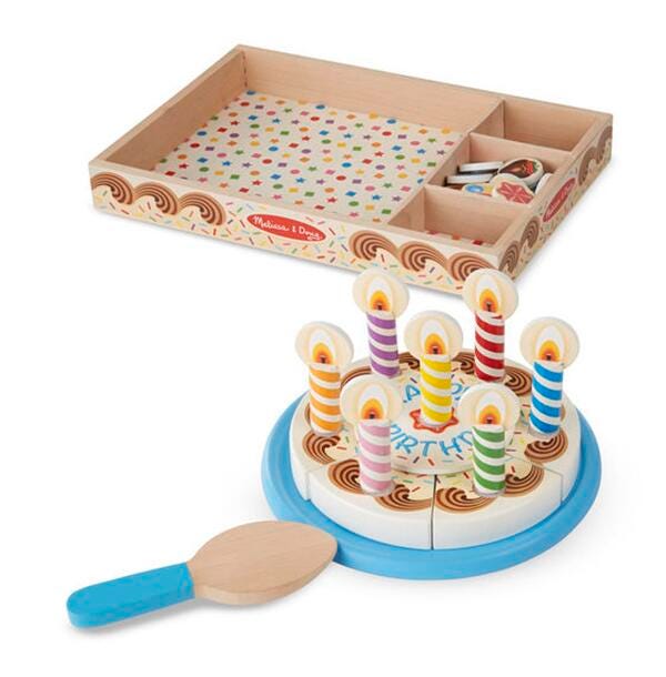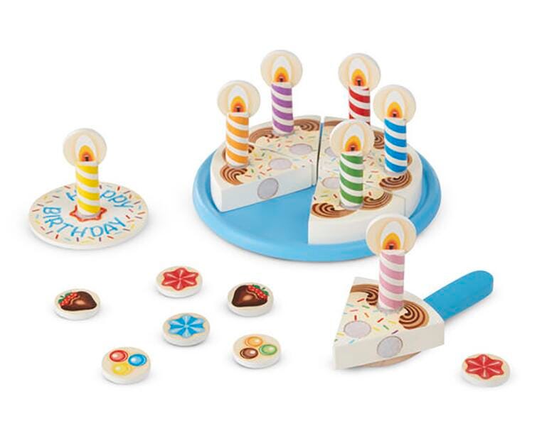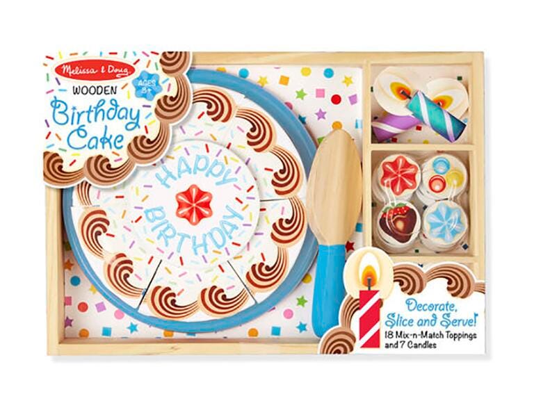 Every day is a celebration with our festive birthday party! This wooden set includes 6 ready-to-cut slices of cake, removable candles and toppings, and a cake plate and server. Use the serving knife to cut a piece and hear a slicing sound! All 34 pieces store neatly in the wooden box until the next celebration. Ages 3 and up.