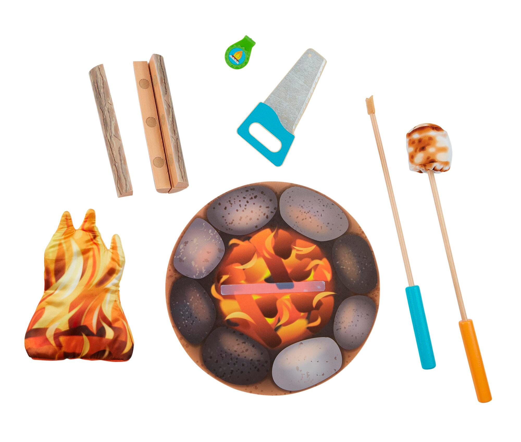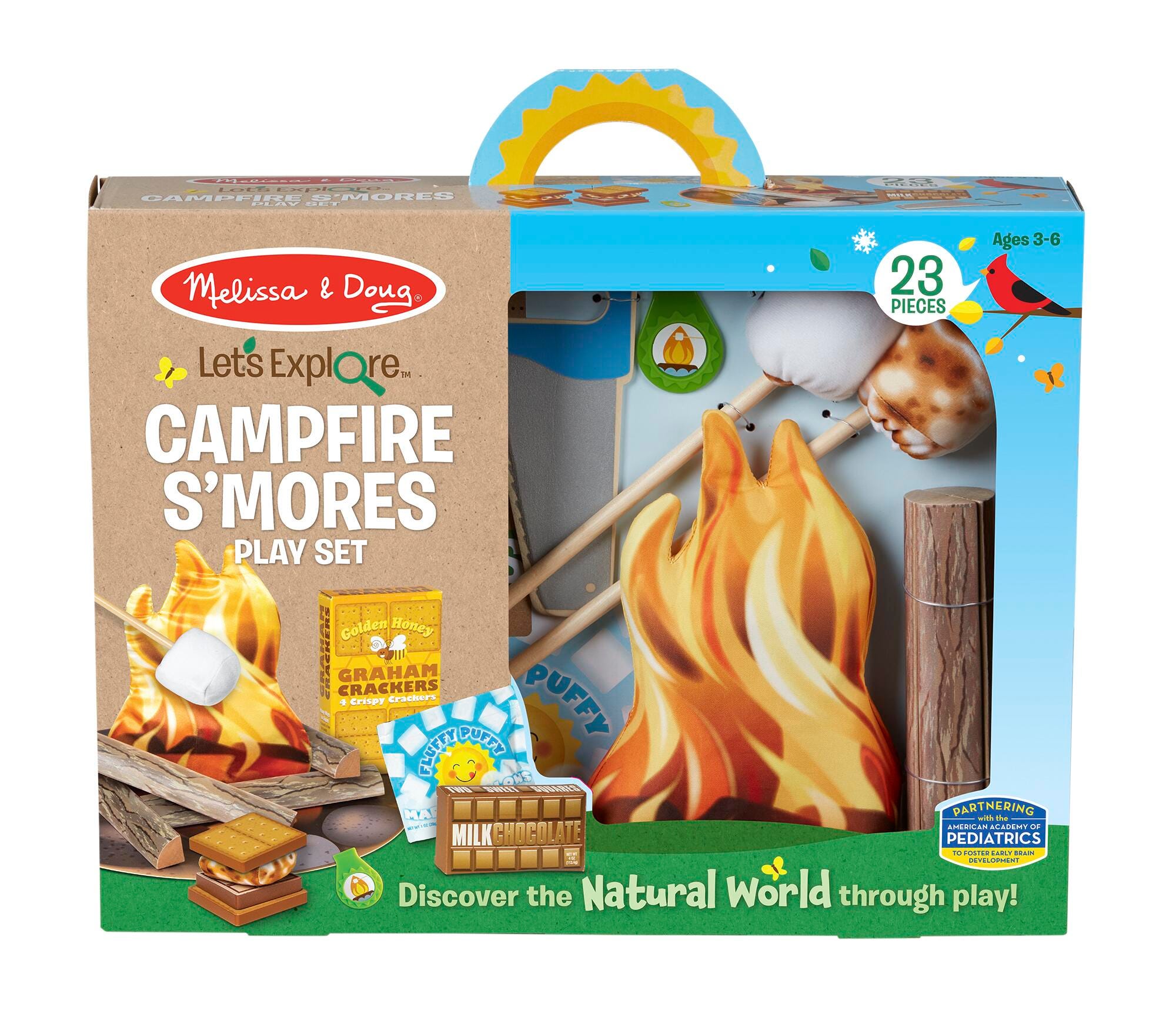 Explore the outdoor experience of toasting marshmallows around a crackling campfire with the 23-piece Melissa & Doug Let’s Explore S’mores & More Campfire Play Set!