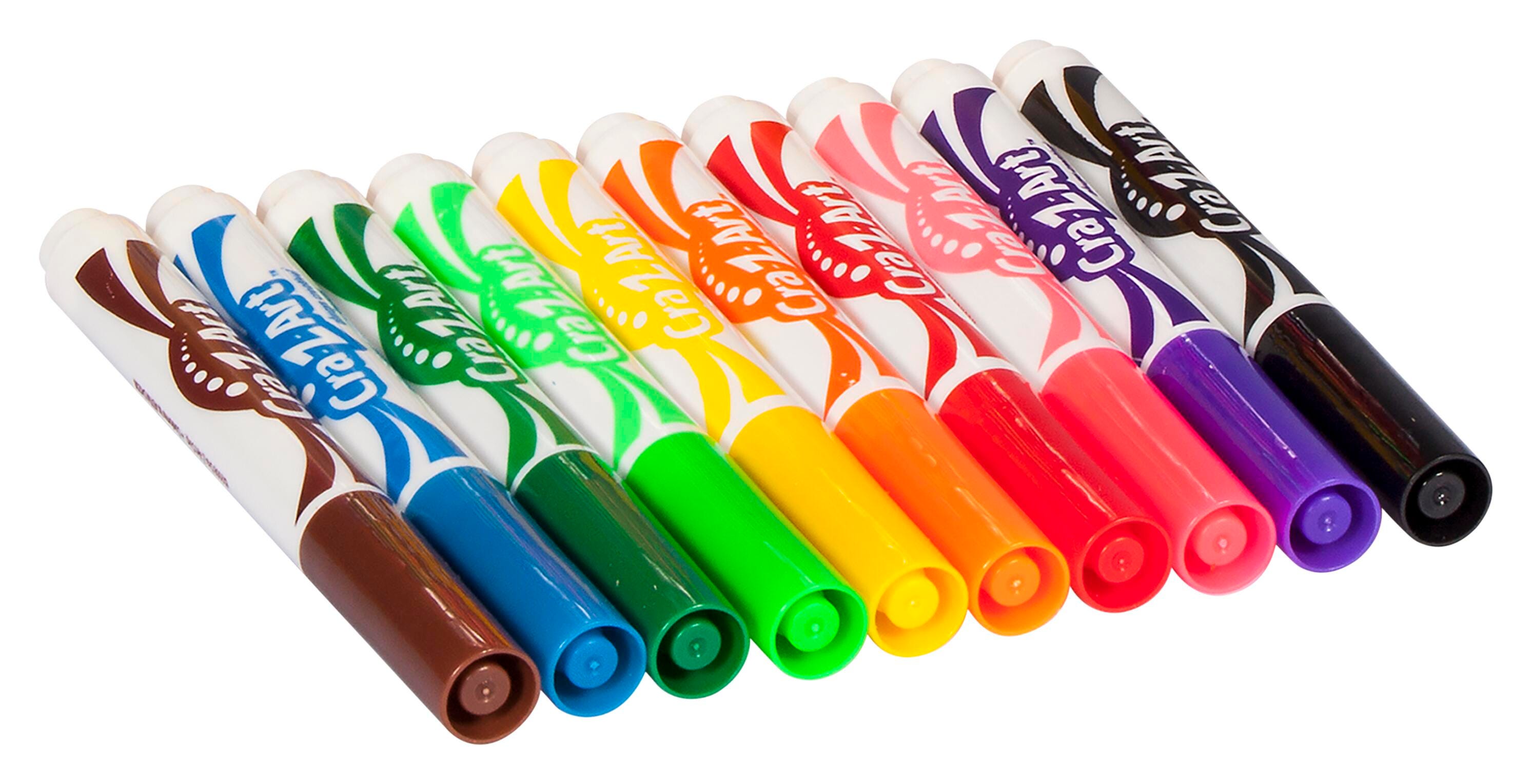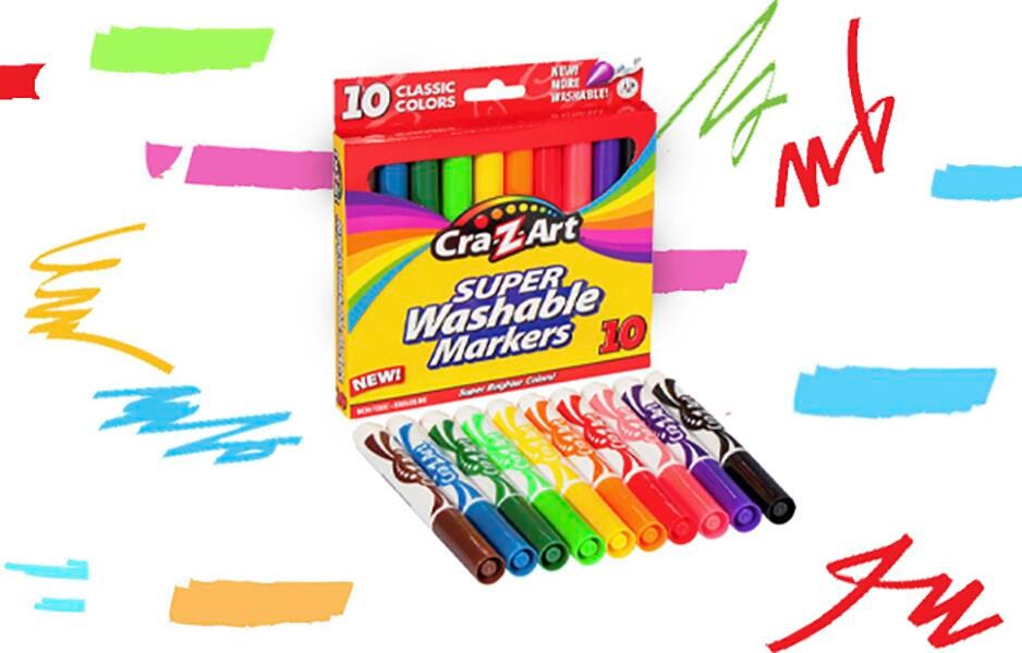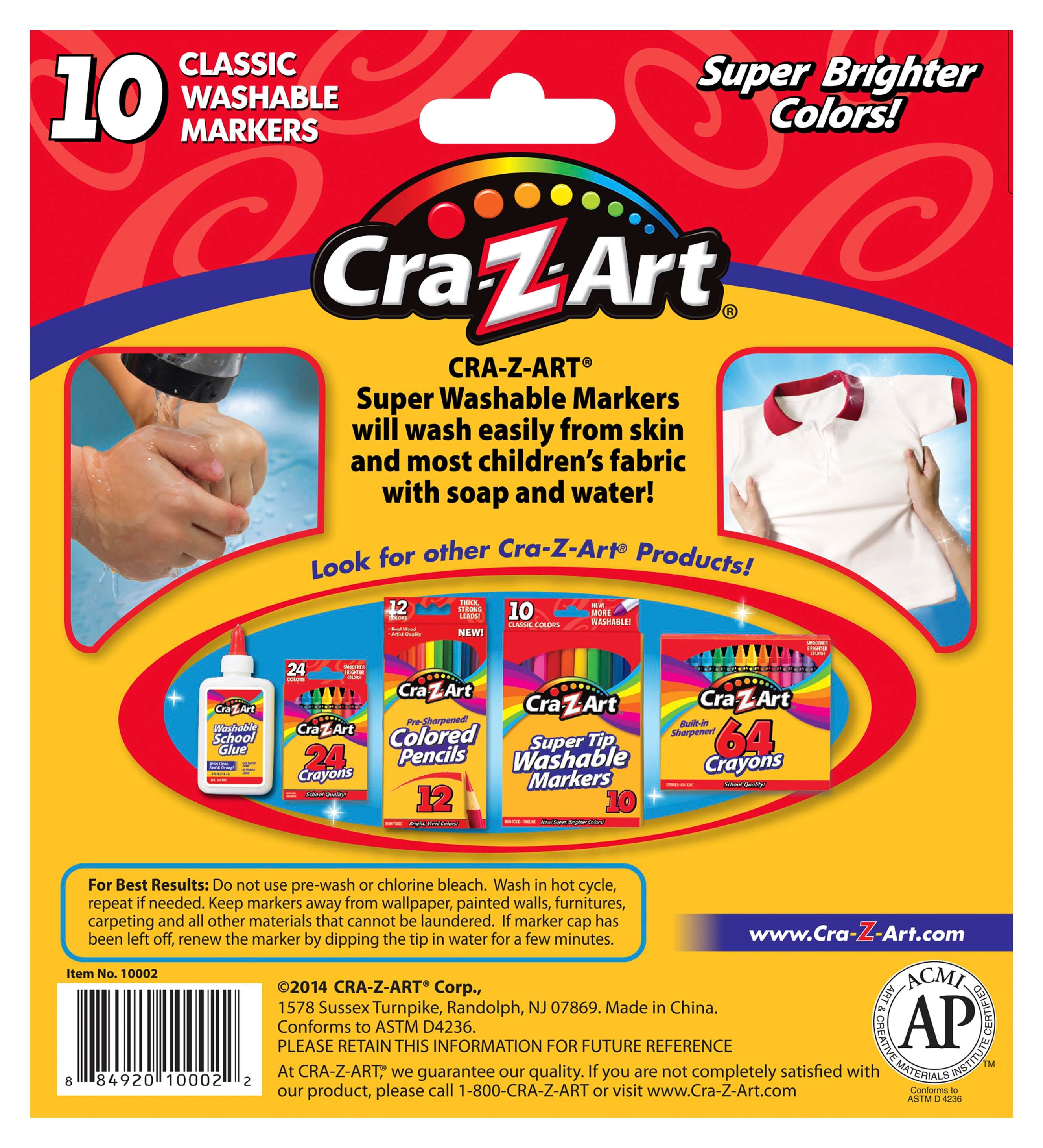 With this versatile set of Cra-Z-Art Super Washable Markers, you can make any art project pop with vibrant colors! This 10-count marker set includes super bright, classic, and bold rainbow colors that are sure to delight. Simply adjust the marker's angle to create thick or thin lines using the broadline tips. Markers are school quality and AP-certified non-toxic, recommended for children 3 and up. Ink easily washes off skin with soap and water, and will not stain most fabrics. Add a spark of imagination to school projects, posters, home crafts, journals, and more with these bold and vivid colors! Great value for parents and teachers alike. Be "always creative" with Cra-Z-Art.Features