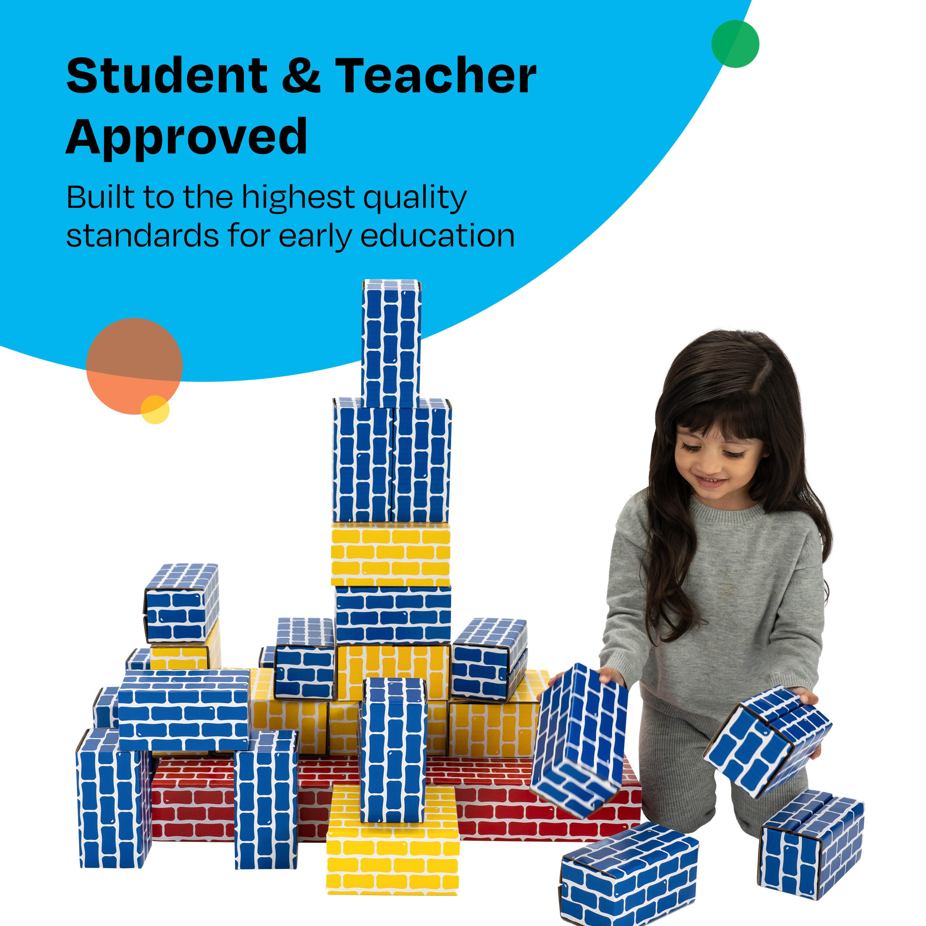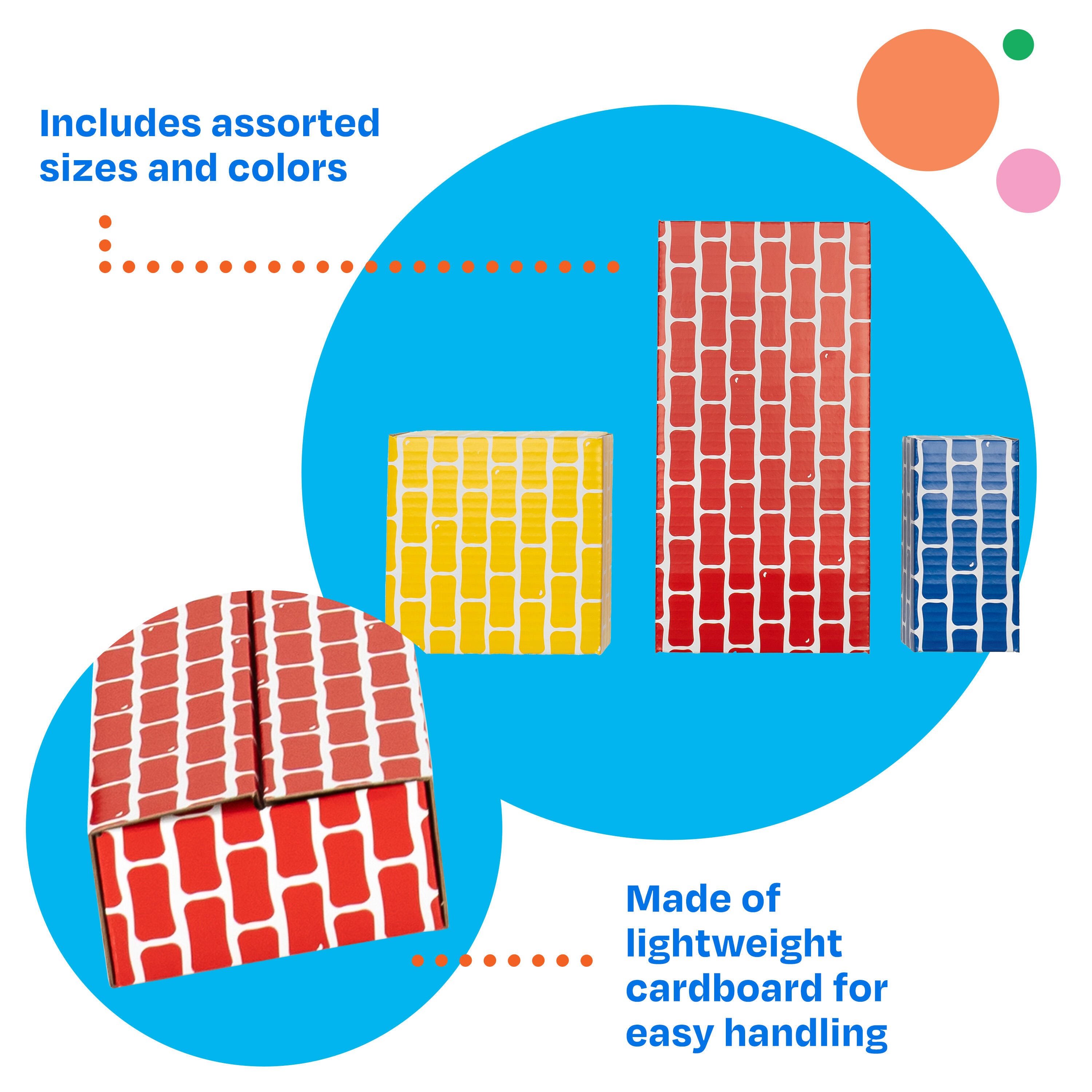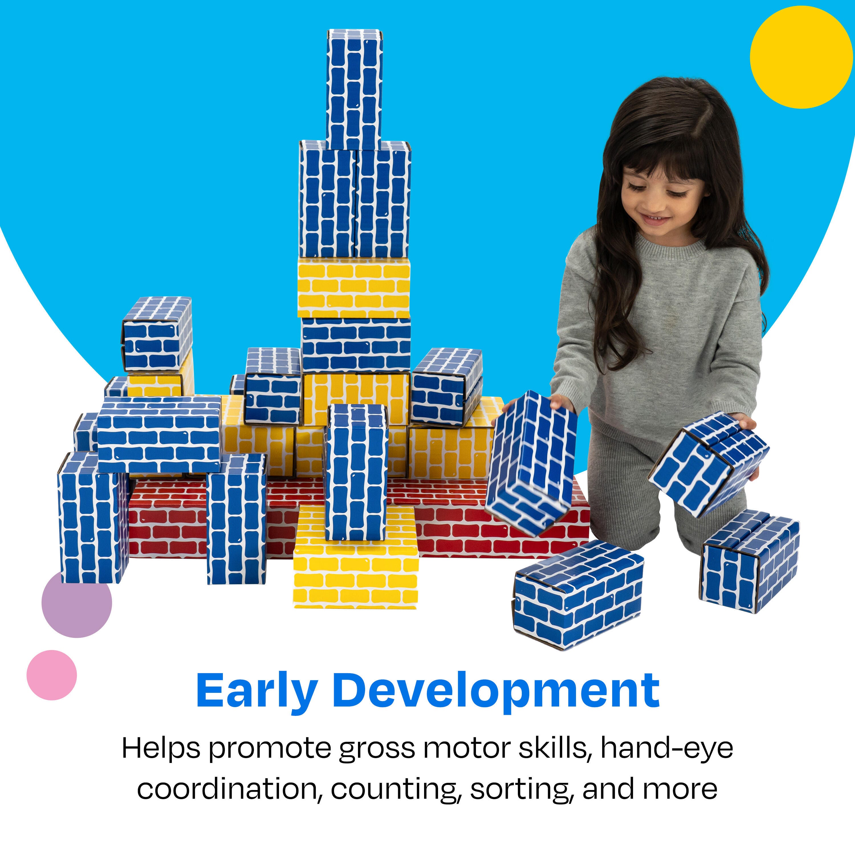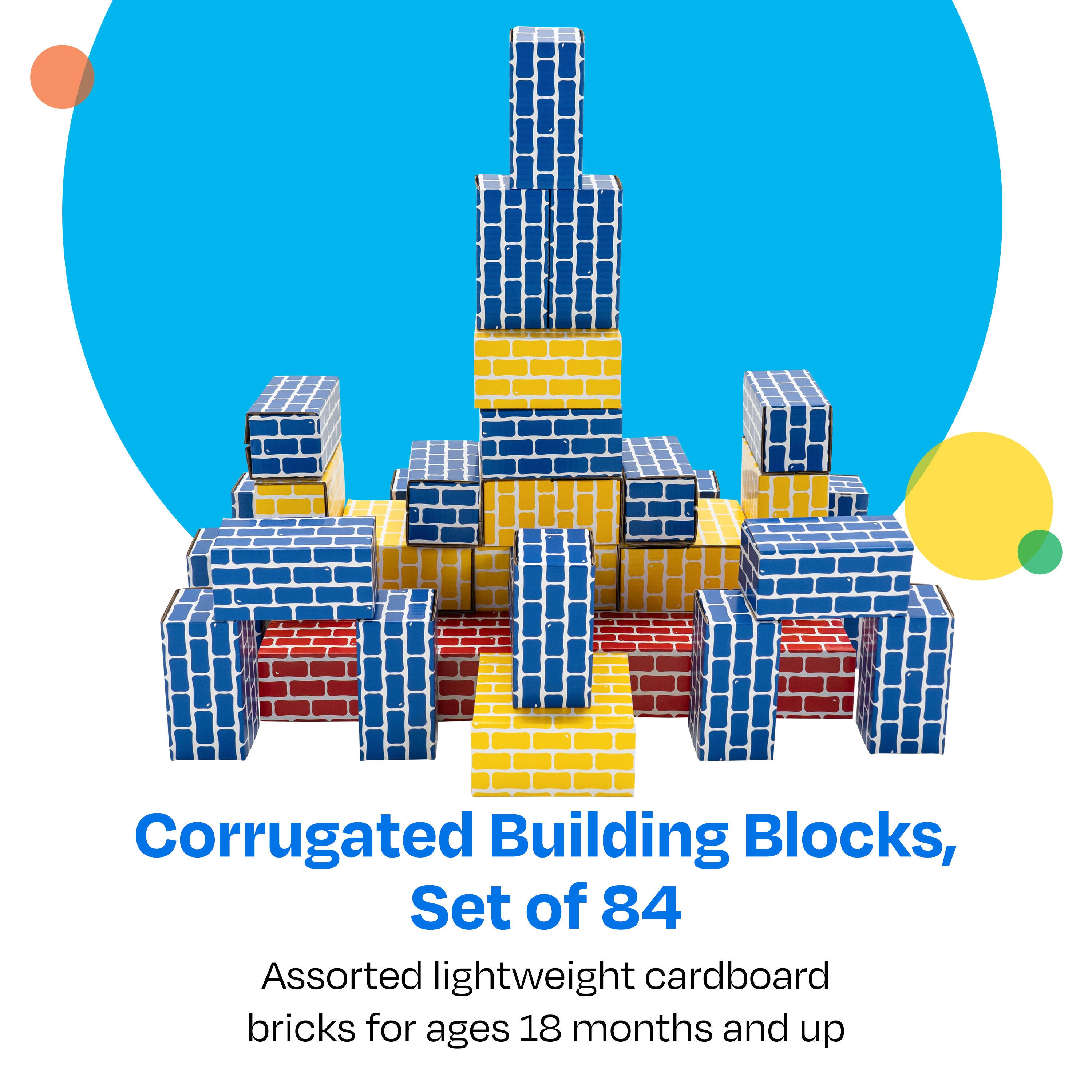 Childcraft® Corrugated Building Blocks are a lightweight and durable way to encourage creative exploration and hands-on learning. This set includes 84 sturdy blocks in various sizes and colors, perfect for stacking, building forts, or imaginative play. Made from laminated corrugated cardboard, these cardboard bricks are strong enough to withstand repeated use while remaining easy for young learners to lift and position. The flat surfaces make cleaning a breeze. Designed for toddlers 18 months and up, these cardboard blocks are ideal for developing gross motor skills, spatial awareness, and problem-solving. Simple assembly required. This cardboard block set includes assorted colors and sizes. Large blocks come in red and measure 12 L x 6 W x 3 H inches. Medium blocks come in yellow and measure 6 L x 6 W x 3 H inches. Small blocks come in blue and measure 6 L x 3 W x 3 H inches.Features