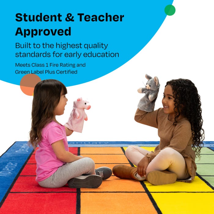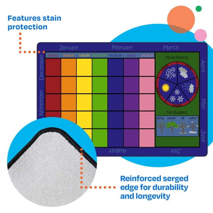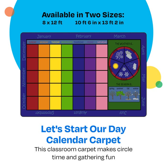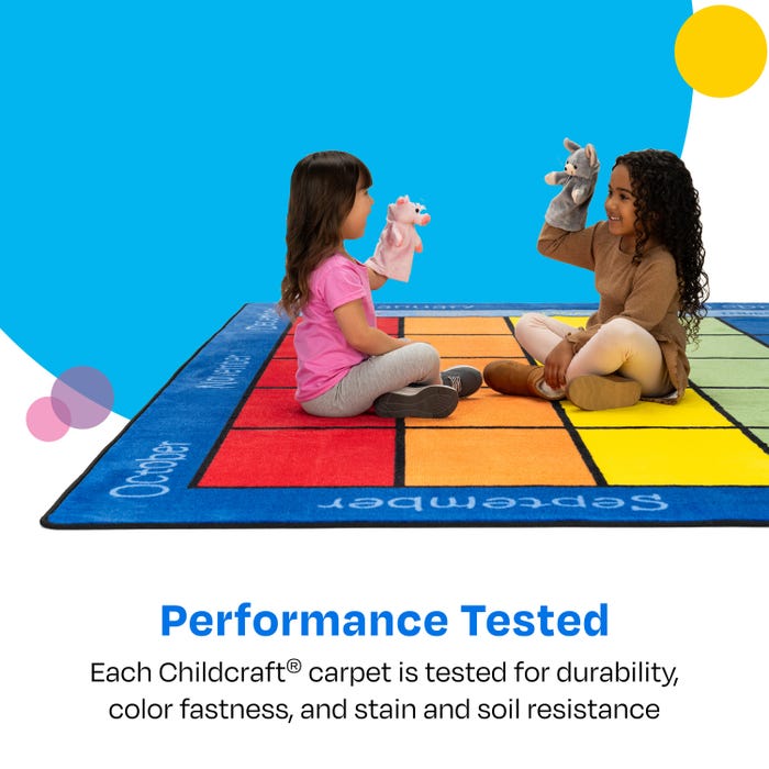 Childcraft® Let's Start Our Day Calendar Carpet offers a vibrant, interactive way to teach students about the days of the week, months of the year, seasons, and weather. Designed for preschool, playroom, or classroom use, this rectangular carpet doubles as a comfortable seating area and a functional accent carpet. The colorful calendar grid and themed sections make it easy to engage students during morning routines or circle time. For added customization and marking special dates, pair this carpet with the optional Childcraft Calendar Carpet Squares (item #2003804; sold separately). Each Childcraft carpet is performance tested for durability, color fastness, and stain and soil resistance for quality you can trust.Features