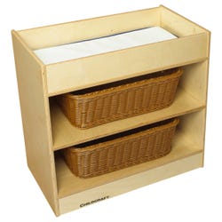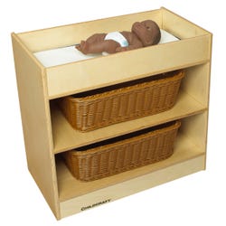 Childcraft® Baby Doll Changing Table brings an authentic touch to imaginative play, allowing children to practice nurturing and caregiving skills. Constructed from durable birch plywood, this wooden doll changing table features two open shelves for convenient storage of doll accessories, clothing, or play diapers. The compact and sturdy design ensures long-lasting use in classrooms, childcare centers, or home play areas. Smooth, rounded edges and no exposed fasteners provide a safe play experience, while the stain-resistant coating makes cleaning easy. Designed to fit standard-sized dolls, this realistic play table encourages social interaction, role-playing, and emotional development. Measures 25-5/8 W x 14-1/4 D x 24 H inches. Recommended for ages 3 and up.Features
