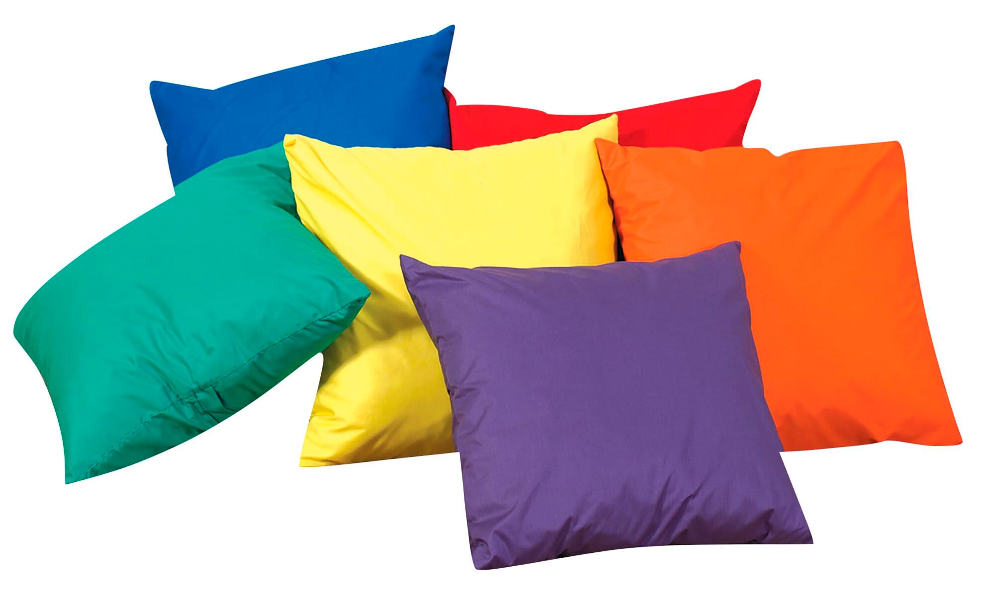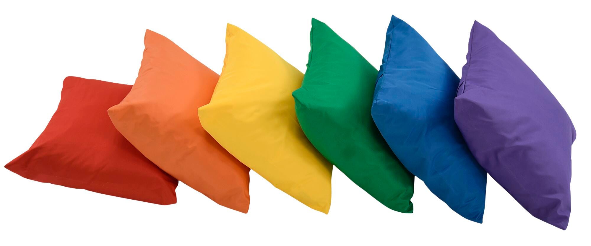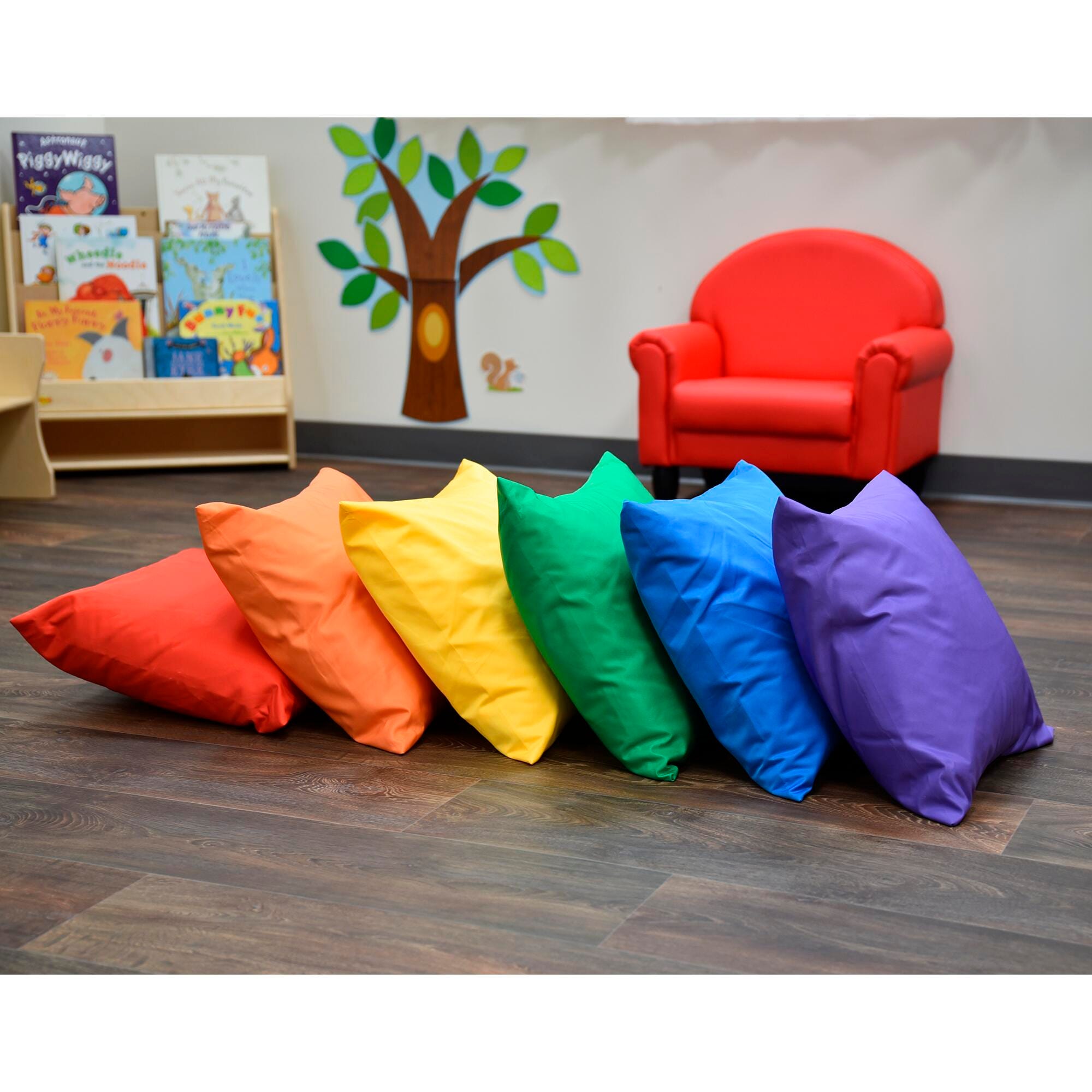 Find a rainbow of comfort in these vibrant and versatile pillows that can be used as floor cushions or supported seating. These soft pillows are in vibrant primary colors, perfect for early color identification and made high-contrast for easy visibility. Pillows are filled with polyester fiber and have removable washable and dryable polyester covers. Measures 12 L x 12 W inches, with a thickness of 4 inches.Features