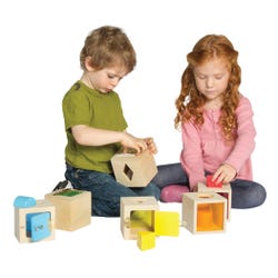 Unlock the box to reveal the colorful shape inside. These six boxes contain unique lock mechanisms to encourage problem-solving in young learners, designed with a peekaboo window to see what's inside. Includes six boxes with six shapes in varying colors.