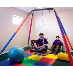 Carpeted Plywood Platform Swing is made with light-but-strong Baltic birch plywood. Has no sharp corners and allows the user to easily sit, kneel, stand or crouch. The swing can be used with a swivel hook or with the 2 stationary hooks for a place to sit, stand, read or receive therapy. Swing also works as a glider when placed sideways. Measures 30 x 30 x 1/2 inches. Can hold up to 3 people; weight capacity: 350 pounds. Swing only, Frame not included.