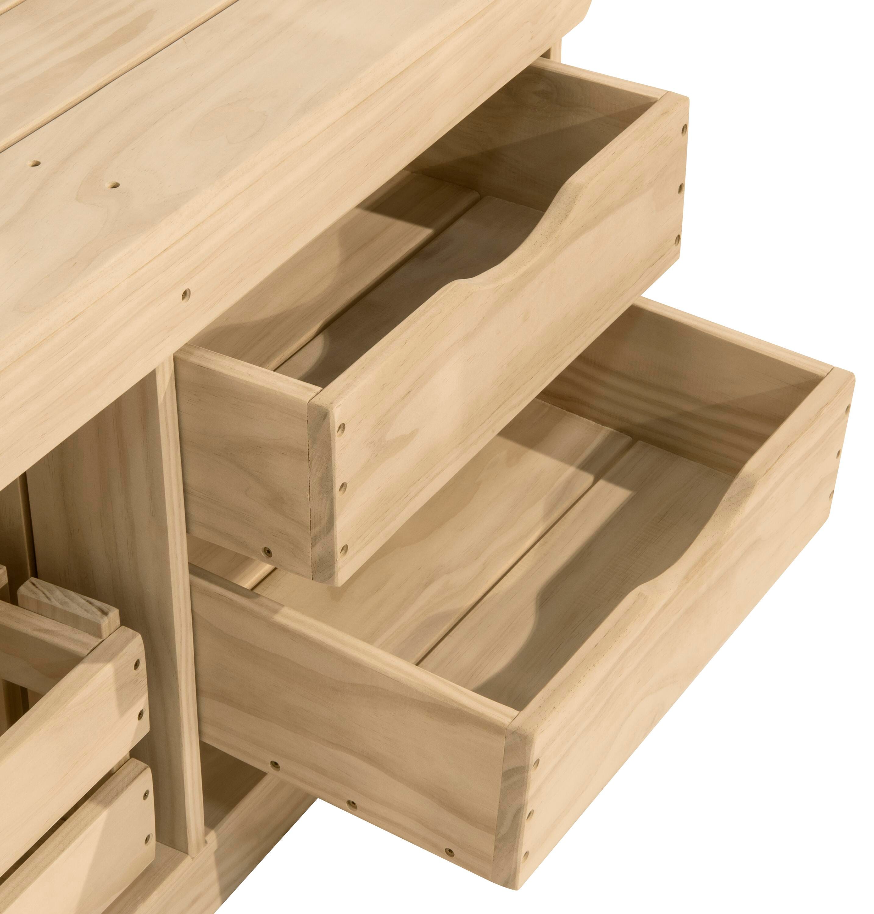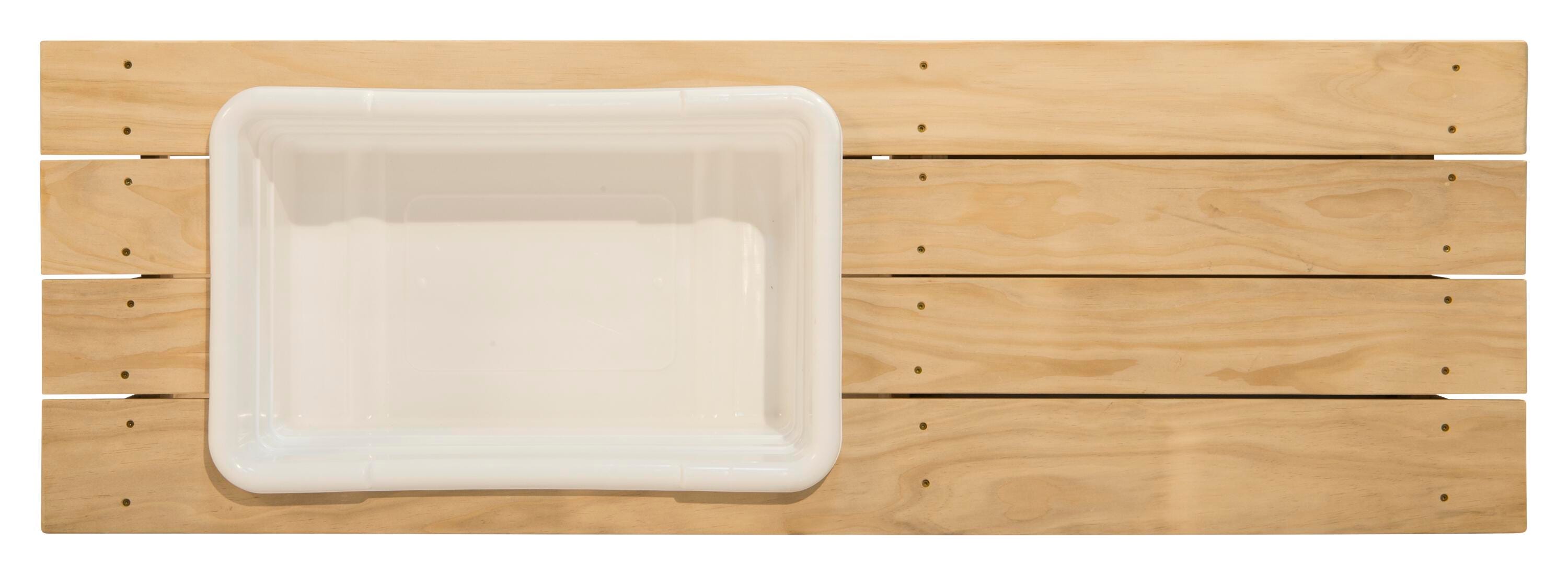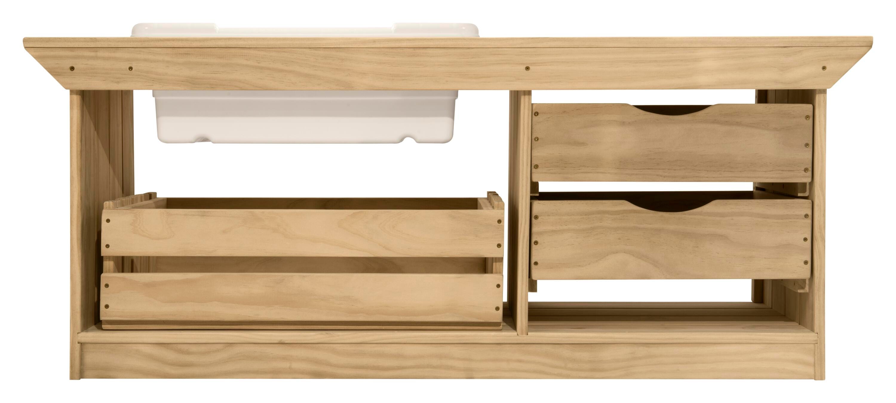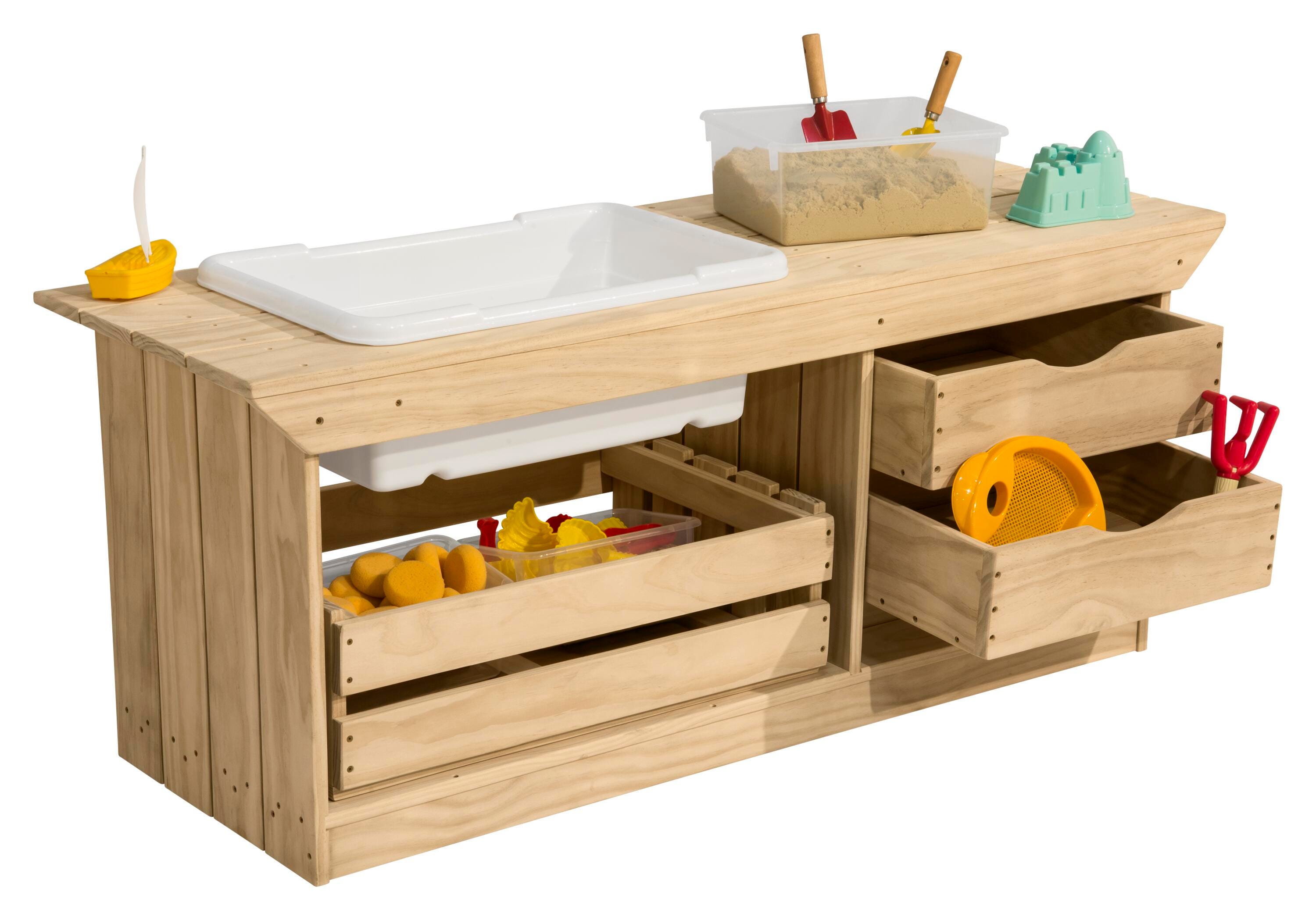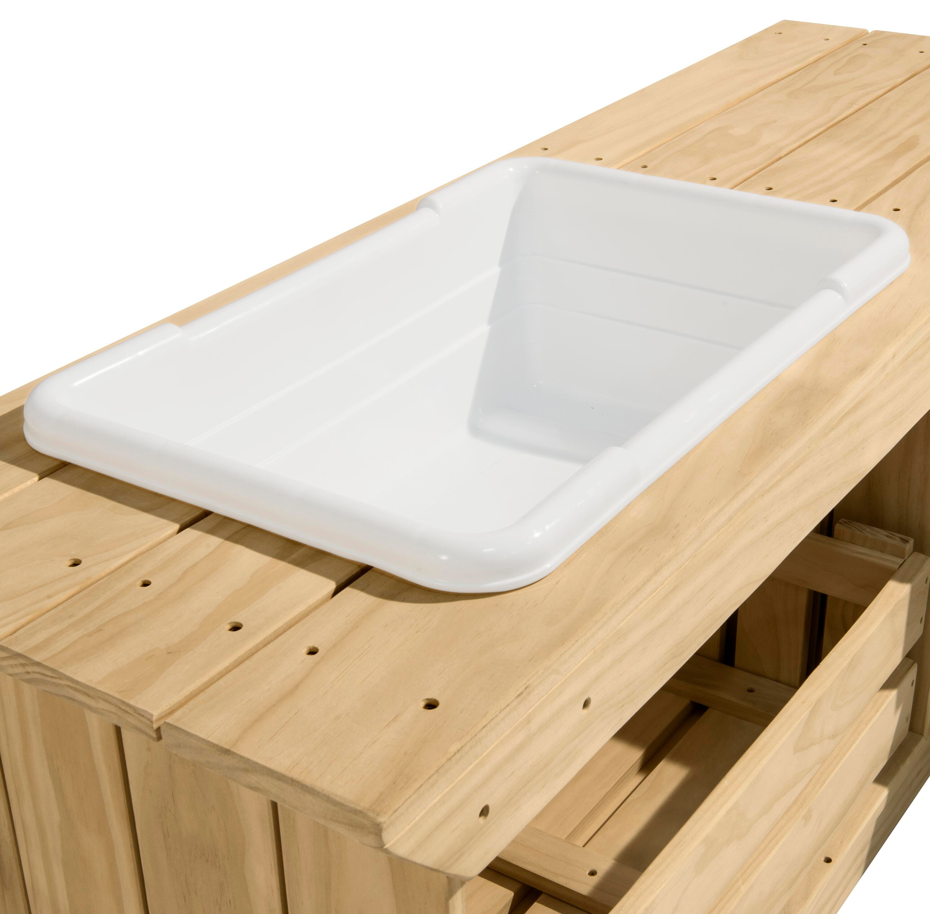 Take playtime outdoors with the Wood Designs Outdoor Mud Kitchen. This outdoor kitchen is made of nontoxic acetylated wood which will not warp, shrink or rot even when exposed to the elements. All edges and corners have been rounded for safe use by young children. The roomy top has a removable plastic liner where kids can sink their hands into water, sand, mud and more. Keep digging tools and other equipment in the two sliding drawers and removable crate. The Wood Designs Outdoor Mud Kitchen is and backed by a 10-year warranty.