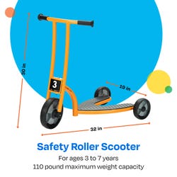 The Childcraft® Safety Roller Scooter is an excellent choice for children ages 3 to 7, providing a safe and engaging way to develop gross motor skills while having fun. A three-wheeled design offers maximum stability, making it an ideal option for children learning to balance, as well as those with reduced mobility or additional support needs. Its durable steel frame and solid rubber tires ensure smooth and steady movement on a variety of surfaces. The non-slip foot platform and easy-to-grip handlebars provide extra security, while the bright orange finish enhances visibility for added safety. With a maximum weight capacity of 110 pounds, this children’s scooter is perfect for preschools, playgrounds, and recreational spaces.