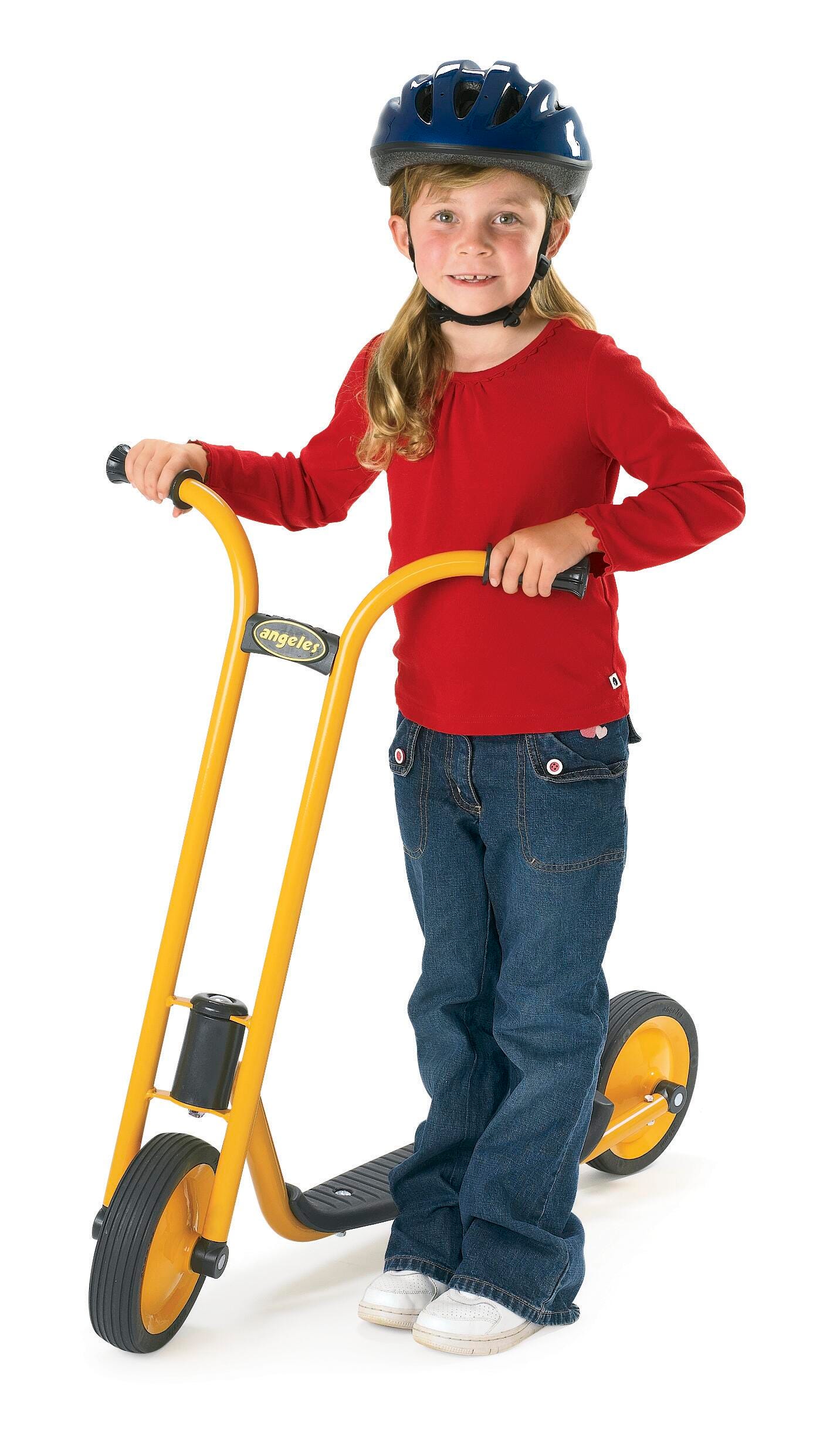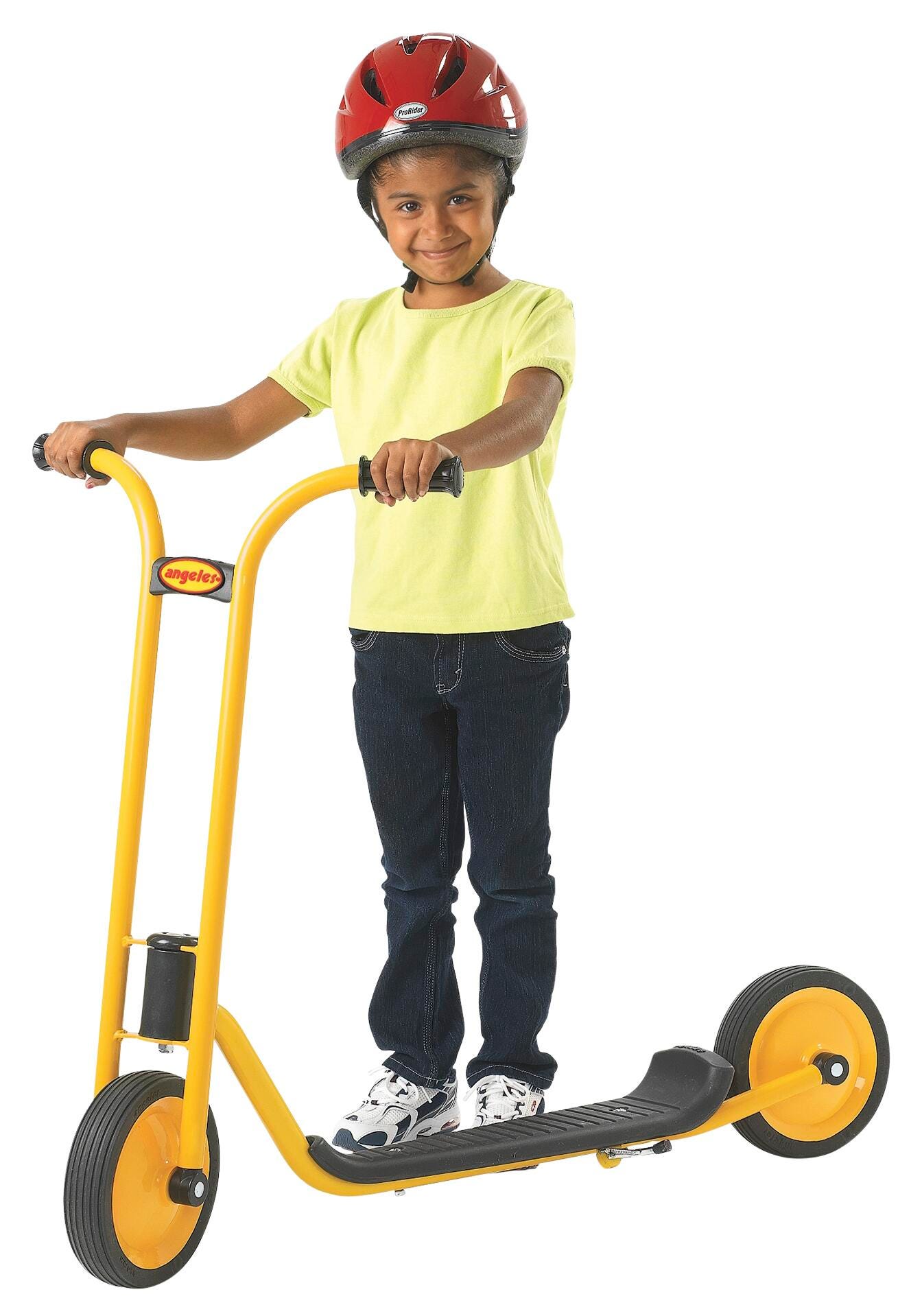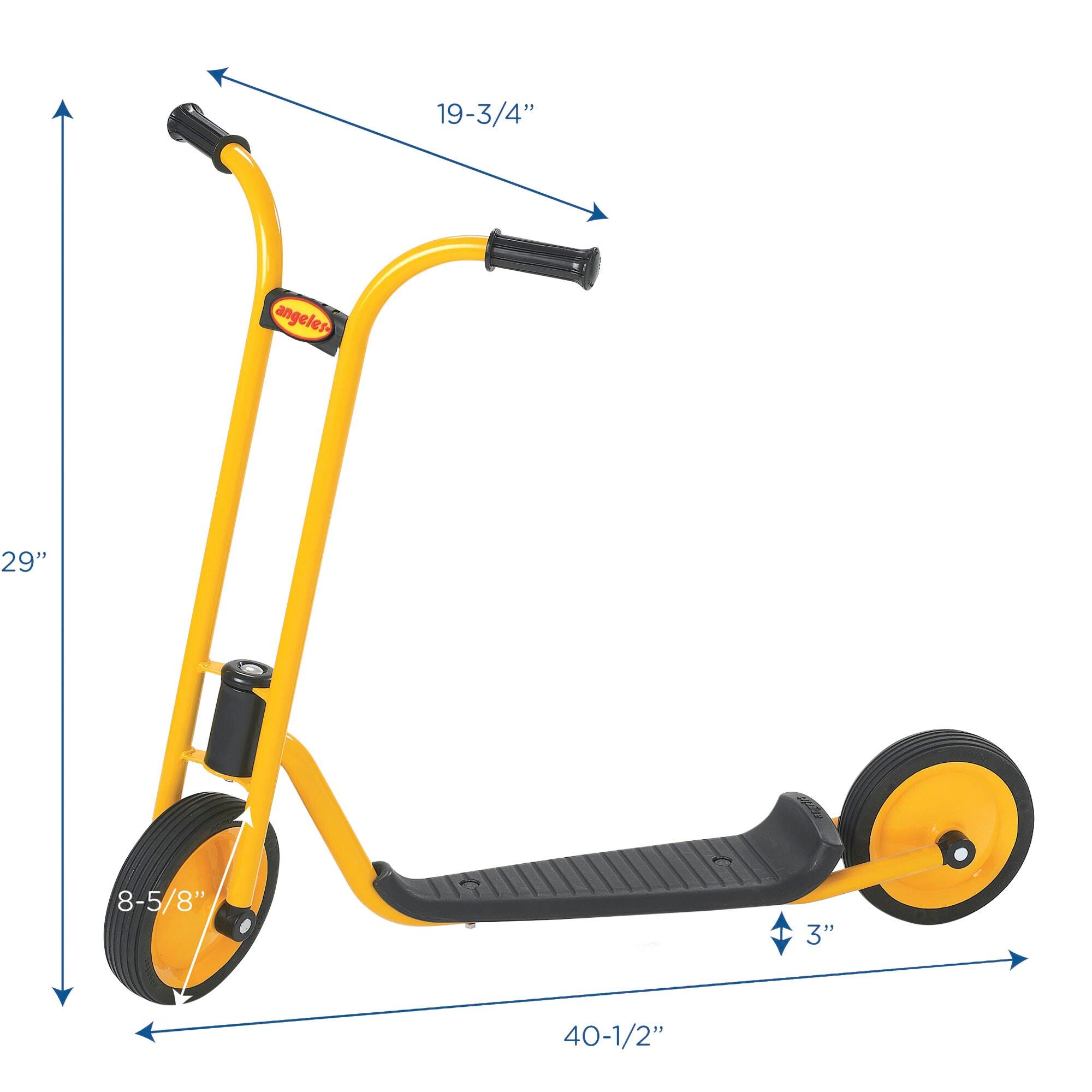 MyRider Scooter features an extra-long sturdy footplate and a rear wheel guard. The footplate measures 3 inches in height, the front wheel measures 8-5/8 inches in diameter, and the handlebars measure 29 inches in height. All MyRider scooters feature a yellow powder-coated steel frame that resists rust that supports up to 70 pounds. Scooters also feature sturdy, solid tires on spokeless wheels and a no-pinch design. Easy 1-bolt assembly is required. Scooters should be stored indoors.