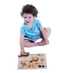 Young puzzle lovers rejoice with a puzzle that helps them develop their fine motor skills. This large knob puzzle from Edushape features realistic, screen-printed farm animal shapes on natural wood background. Just like the joys of solving a riddle, young learners will enjoy assembling, discovering, and deciphering various shapes, colors, and designs - all while enhancing motor skills and logical reasoning in the meantime. This farm-animal-themed puzzle set includes 7 real-life screen-printed shape pieces, including a cow, an orange cat, a sheep, a rooster, a donkey, a couple of ducks, and a horse. Each piece is affixed with large round knobs for easy grasp and placement. High-quality, smooth wooden board measures 9-1/2 L x 12 W x 1 H inches. Puzzle for ages 2 and up.Features