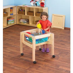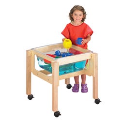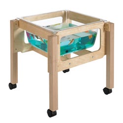 The Childcraft® Mini Sand and Water Table provides endless opportunities for sensory play and STEM exploration. Perfect for classrooms, childcare centers, and home learning spaces, this compact activity table features a sturdy birch plywood frame with a 4-coat UV acrylic finish for lasting durability. The included tub can be filled with sand, water, or other sensory materials to support hands-on discovery, fine motor development, and early science concepts. Equipped with smooth-rolling casters that lock for stability, this mobile sensory table is easy to move and secure in place. A top cover allows for multiple uses. Measures 23-1/4 W x 23-1/4 D x 24 H inches.