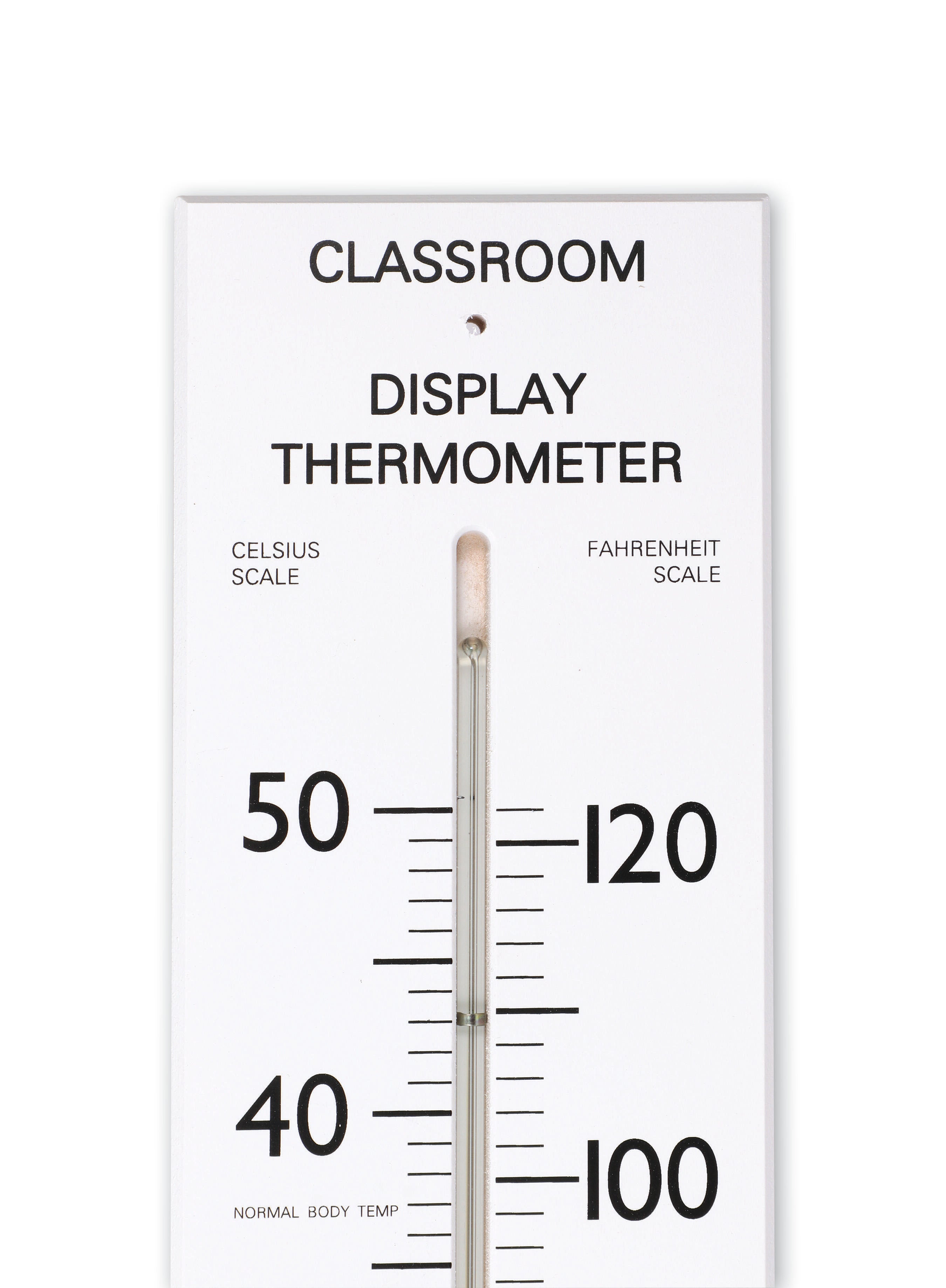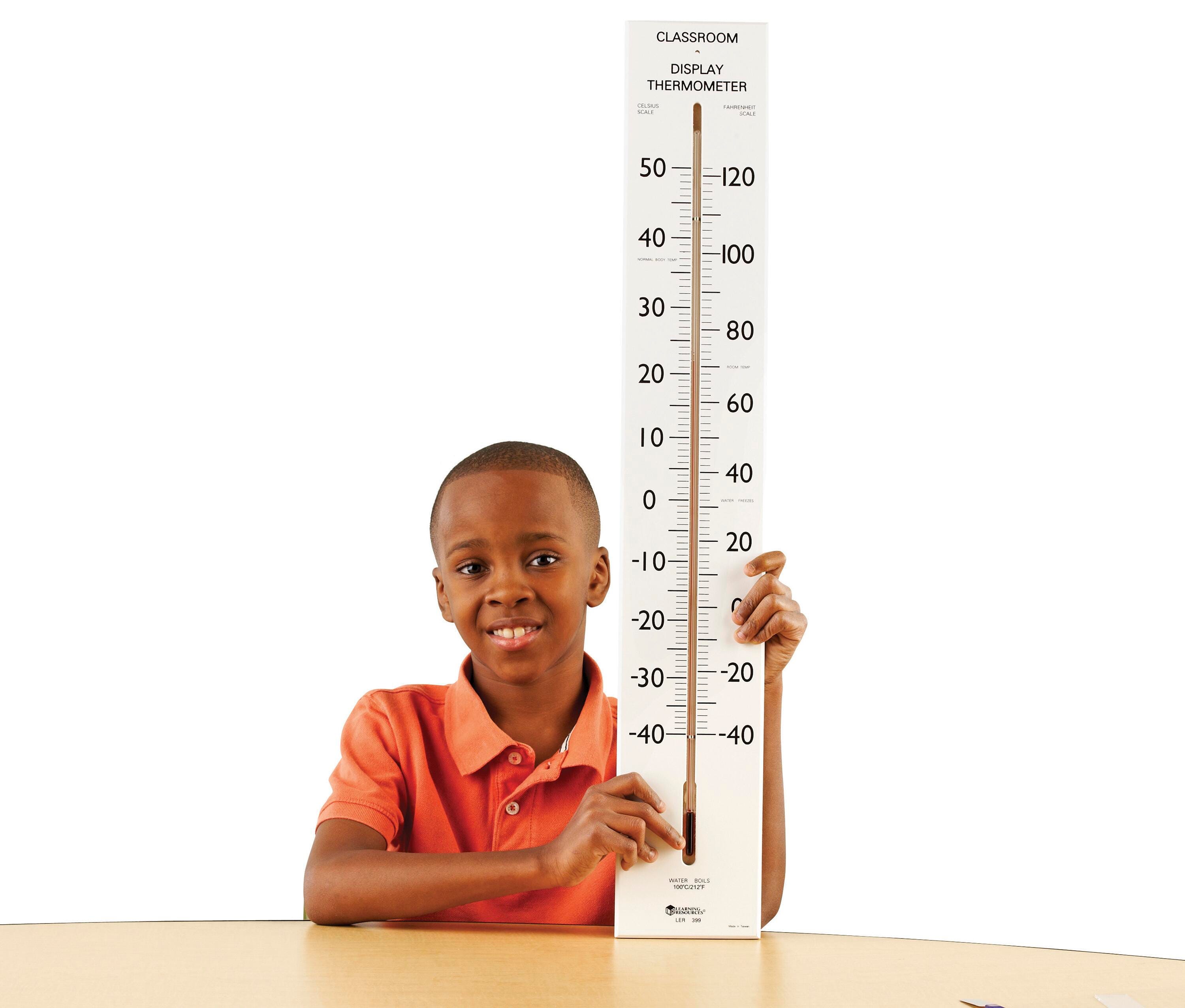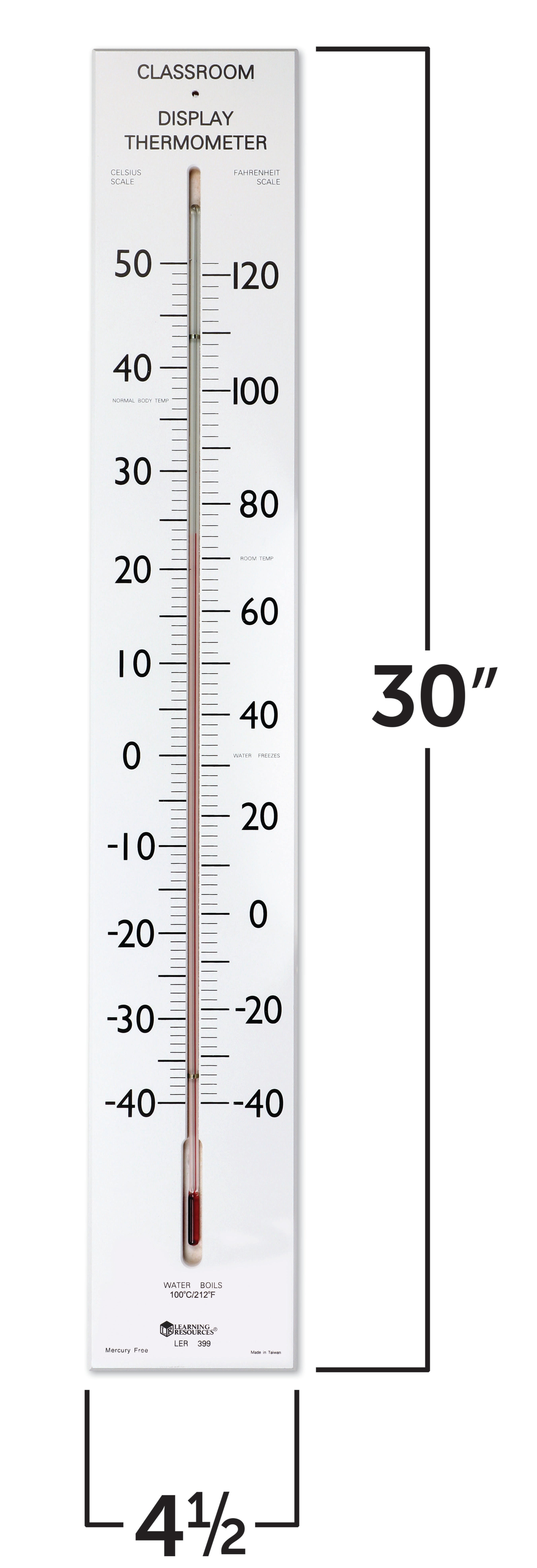 Learning Resources Giant Classroom Thermometer shows both Celsius and Fahrenheit scales from -40 C to 50 C degrees and -40 F to 120 F degrees. This wall-mountable thermometer features a wooden frame and measures 30 inches in height. Recommended for Grades K and above and Ages 5 and up.