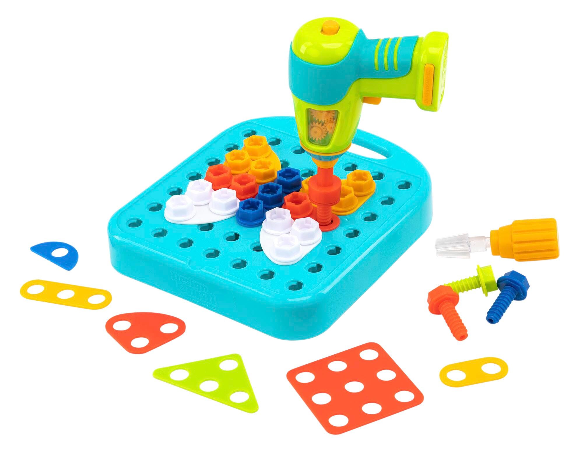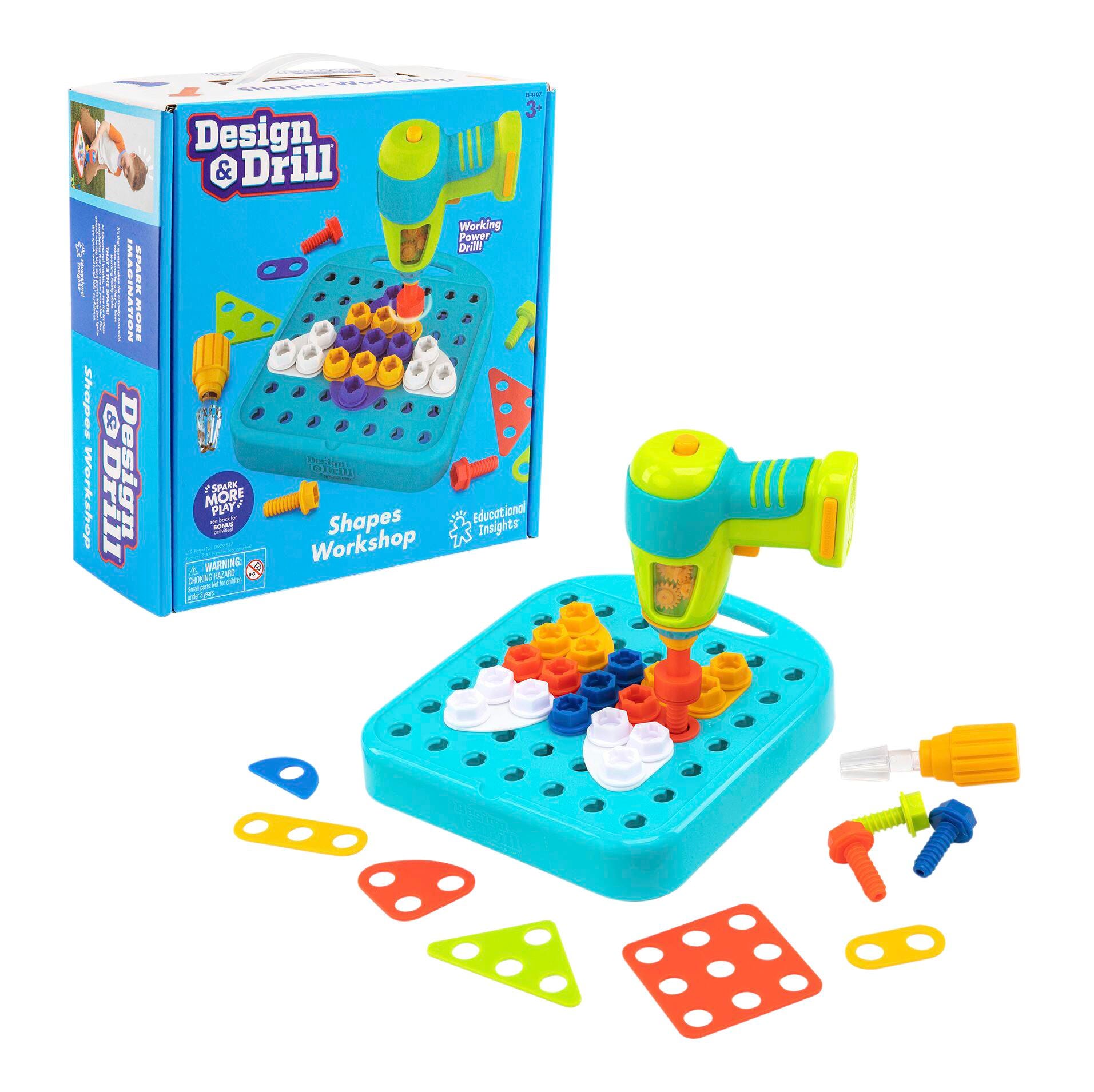 Preschoolers use a kid friendly power drill, decorative design plates, and matching bolts to create colorful works of art. Includes activity board with handle, drill, screwdriver, Philips bit, socket bit, 24 design plates, 44 bolts, and guide with patterns to copy.At Educational Insights we've been helping kids learn through play for the last 60 years. We take great pride in working with experts in many distinct fields—from scientists to teachers to artists—to ensure that our products are always the very best they can be. Our award-winning, best-selling toys and games introduce new interests, unleashing limitless possibilities and passions including Coding Critters, Hot Dots, Design & Drill, Playfoam, GeoSafari, Kanoodle, and BrainBolt.