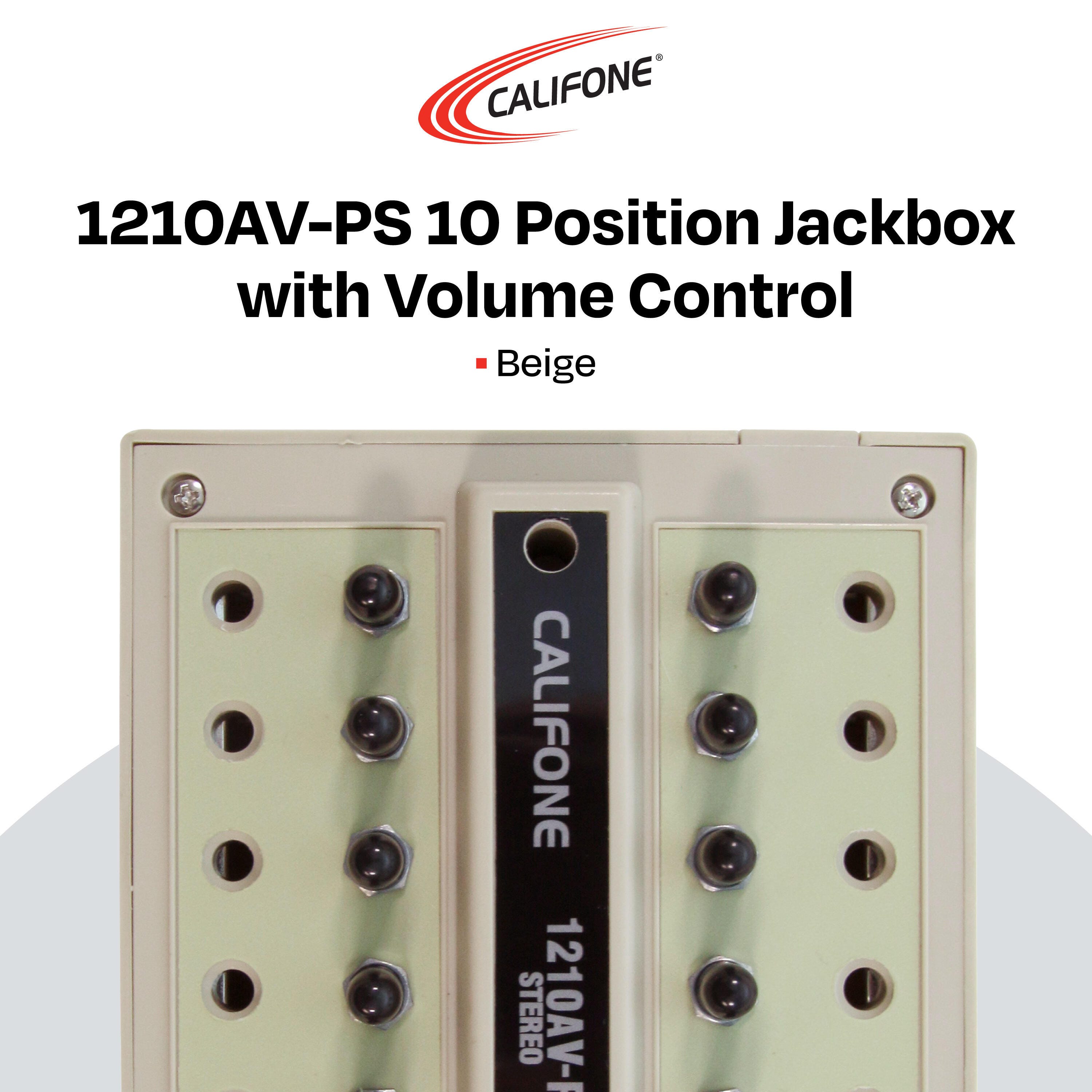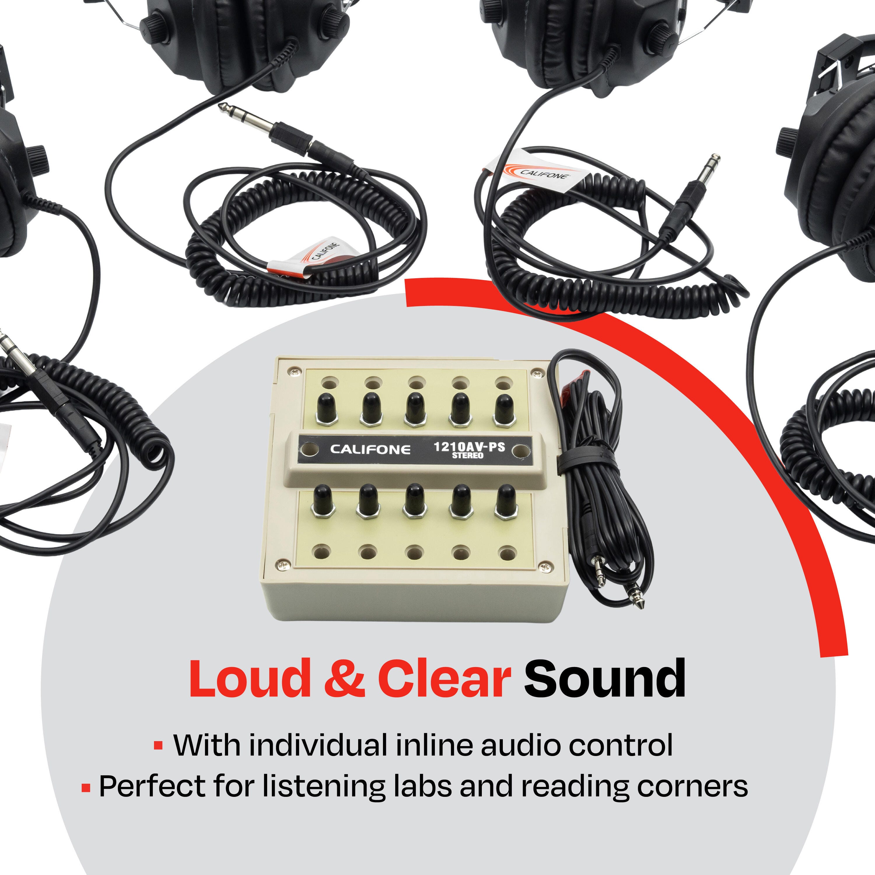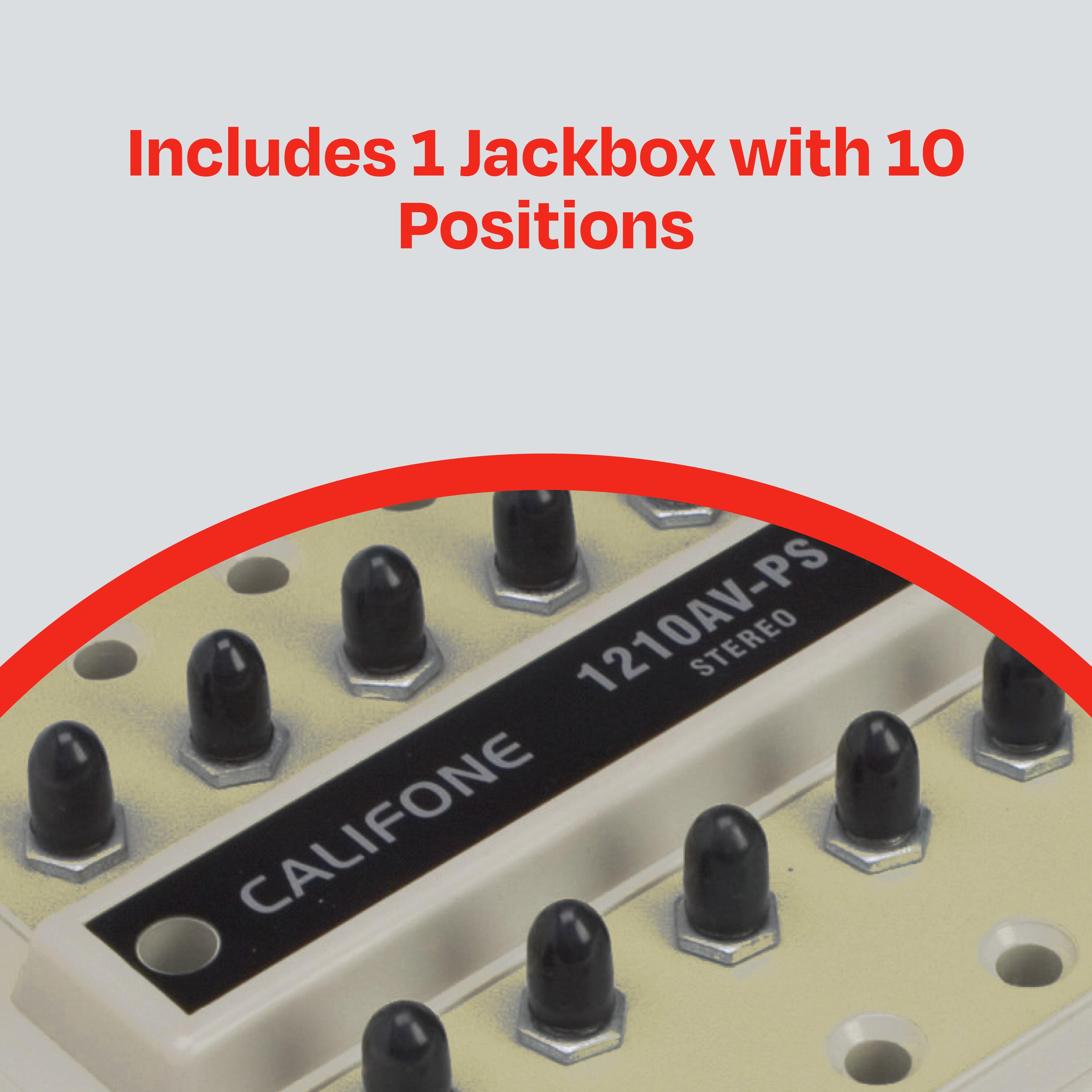 The Califone 1210AVPS Jackbox has ten positions featuring silver-plated contact points for better connection and moisture resistance. Designed with rugged plastic and skid-resistant pads to ensure it stands up to the demands of your high-traffic listening labs, language learning centers, reading corners, and beyond. Each position has individual volume control and 1/4 inch jack. The permanently attached cord is 5-foot with 3.5mm stereo and 1/4 inch plugs for connecting to audio source. Jackbox weighs 12 ounces and measures 4-1/4 L x 4-1/4 W x 2 H inches. 1 year warranty with school use.