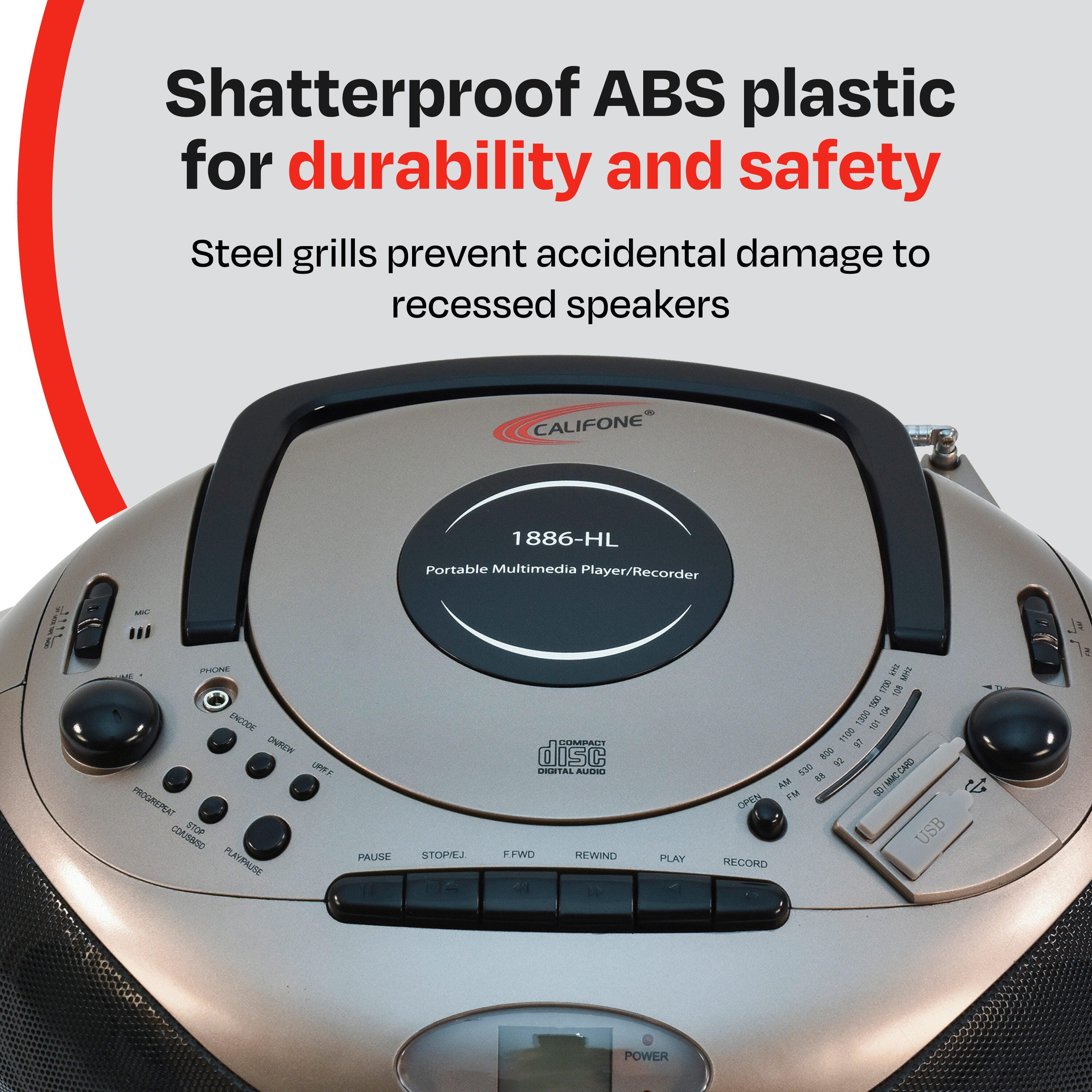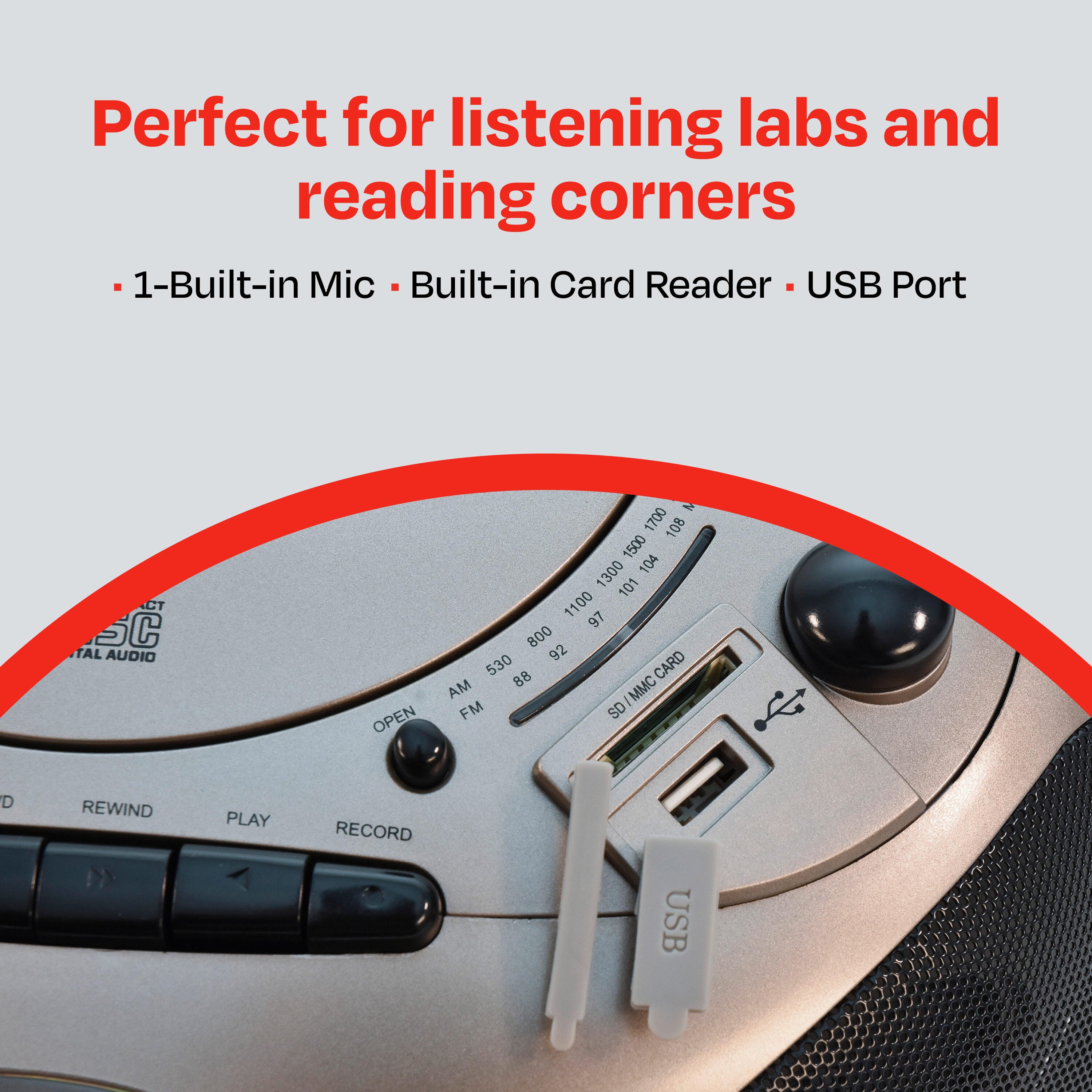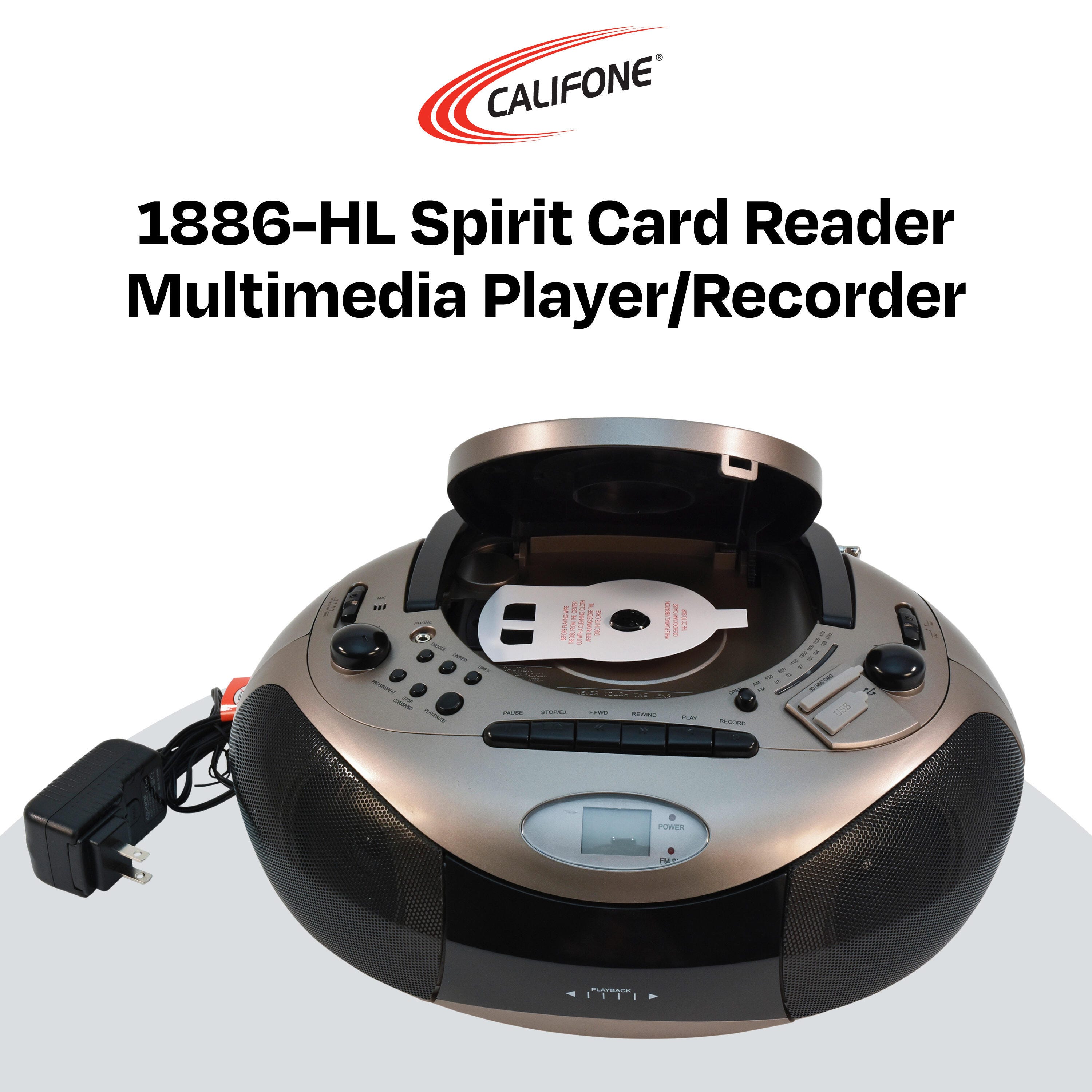 Califone Spirit Card Reader Multimedia Player/Recorder is designed interactive and durable. With its built-in card reader and USB port, the Spirit is made to work with smart devices and WMA as well as CD players, cassette recorders / players and AM/FM radios. This new multimedia player has steel grills that prevent accidental damage to recessed speakers, a top loading CD player tailored for school use and op-mounted 3.5 mm headphone jack for individual use or group learning volume control.