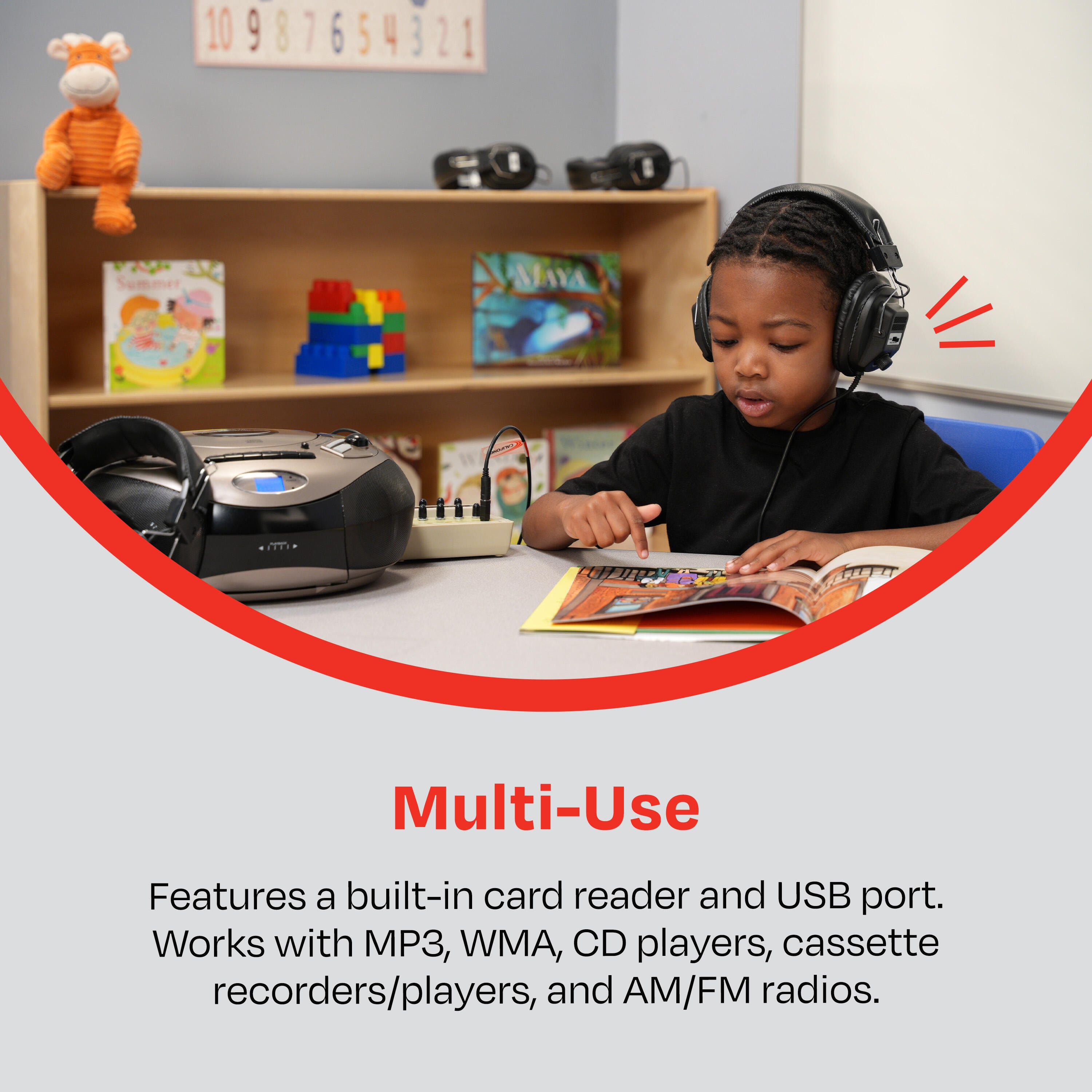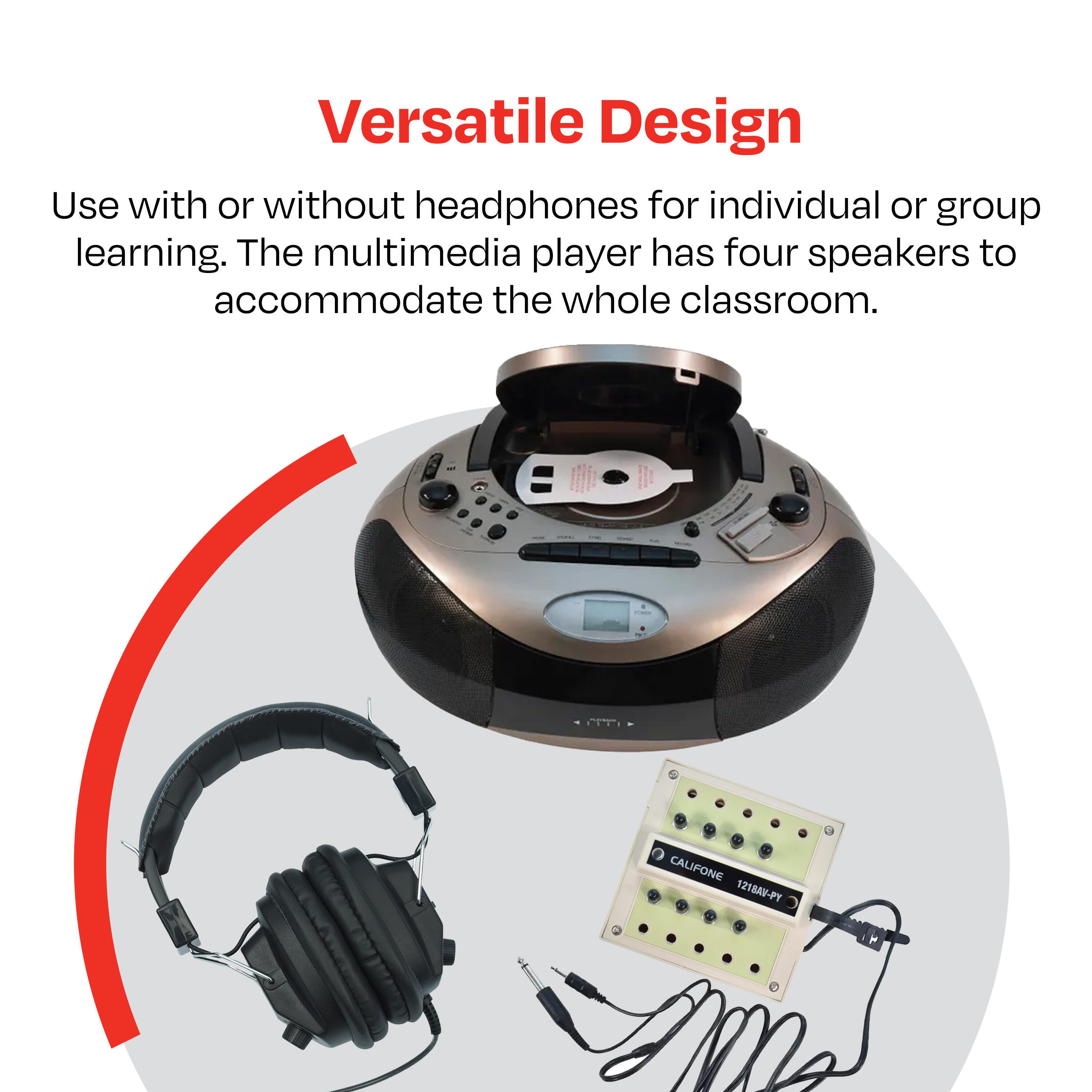 Califone Spirit SD 4-Person Listening Center for Classrooms provides outstanding stereo sound in a portable system. The listening station is perfect for group or individual reading activities, literacy, ELD, ESL, and other language learning programs. Use the stereo system with or without headphones. The four speakers on this multimedia player are loud enough for classroom needs beyond the 4 student capacity. This classroom listening center includes a carry/storage case, a ten position stereo jackbox with individual volume controls, four 3068AV stereo headphones with noise-reducing earcups, and a 6 foot coiled cord with 3.5mm plug. Our set comes with a 3-year headphone warranty and 1-year component warranty for school use.