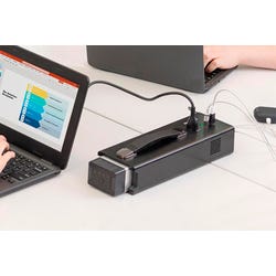 Building on the success of our patented EdgePower Clamp On Desktop Charging Station, this portable laptop charger trades the clamp for a grab handle to provide on-the-go convenience. Like its predecessor, it features a standard AC outlet, a USB-A charging port with Quick Charge 3.0 technology, and a USB-C PD charging port. When loaded with a fresh EdgePower rechargeable battery, it can charge a laptop up to 2 times, a Chromebook or tablet up to 4 times, and a smartphone up to 14 times. The Power Station can also charge a laptop and 2 mobile devices simultaneously. To create a complete system, the laptop power bank requires a KwikBoost EdgePower Rechargeable Battery.Features
