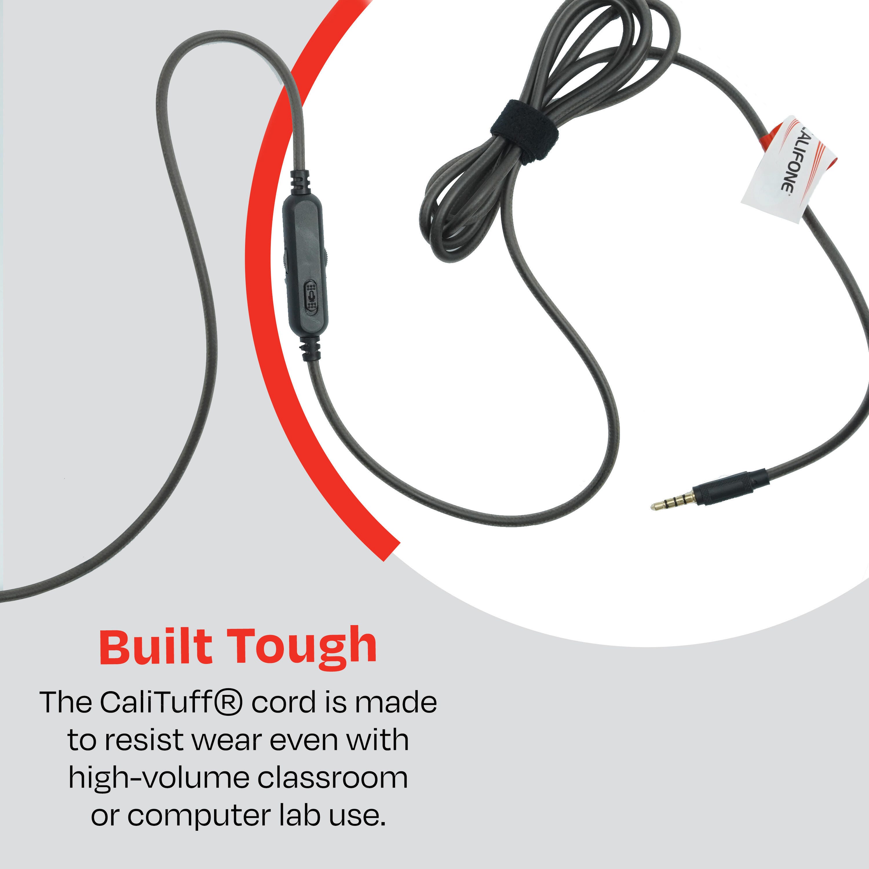 A highly durable CaliTuff cord is made of braided, PVC-jacketed material with a reinforced earcup entry point to resist bending, cutting, and separation