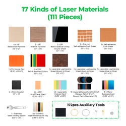 This Laser Material Explore Kit by xTool is a must-have material pack with 17 popular materials, 111pcs laser material, and 172pcs of auxiliary tools. Store every piece in this kit in the 6 included premium kraft paper boxes which help protect the product and keep materials well-organized.Features