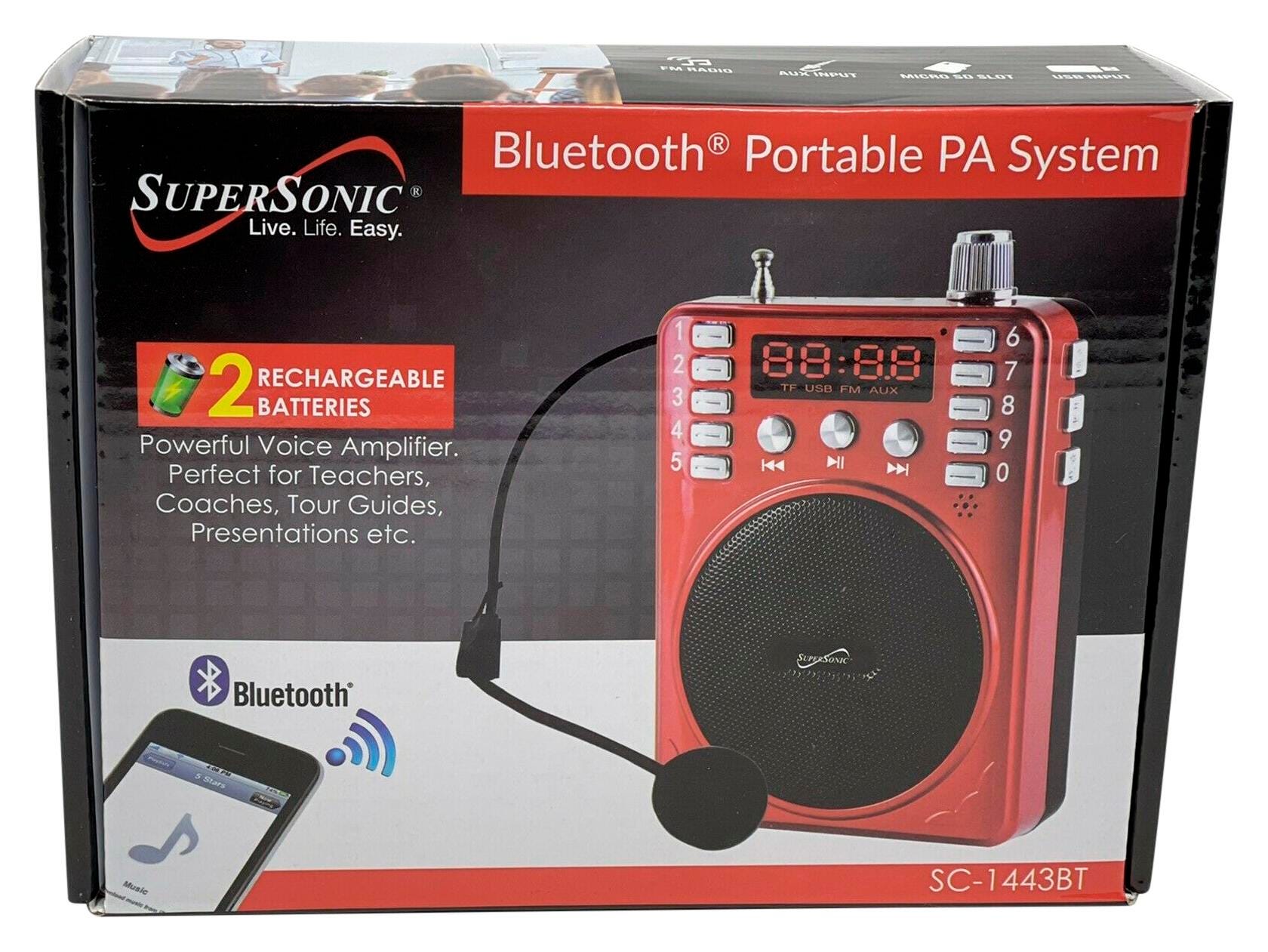 The SuperSonic Portable PA System is the perfect voice amplifier for teachers, coaches, tour guides, presentations and more! It's a lightweight system that offers a lot of features in a small package. The built-in Bluetooth receiver allows you to wirelessly connect to an iPad, iPhone, Smartphone, Android tablet, laptop and other devices. This PA system has a LED display with a built-in FM radio, USB, Micro SD, AUX inputs to play your favorite music from external devices, also a karaoke jack and a recording/repeat feature. Equipped with rechargeable batteries (AC 110V-220V & DC 5V) you can use both batteries at the same time or use one as a backup. 5 watt power output with a frequency response 100Hz - 18KHz.