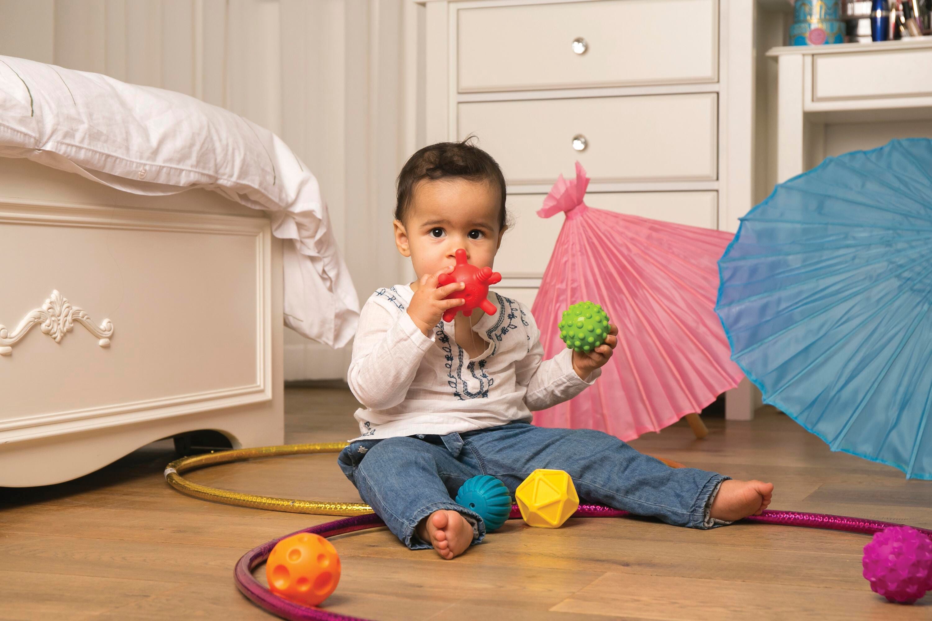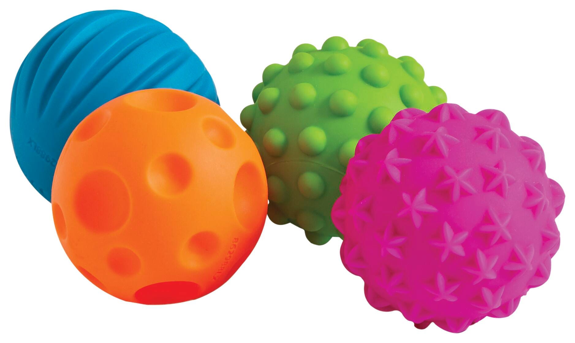 - Designed to inspire fine motor skills with varying textures and gross motor skills when rolled across the floor