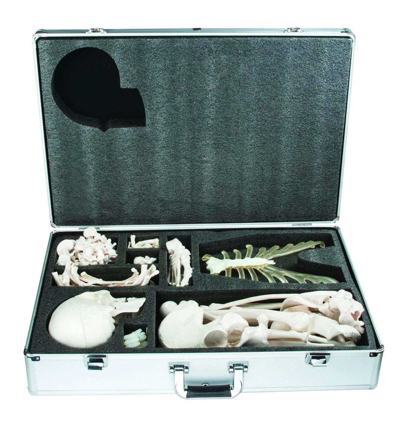 Life-Size male disarticulated human skeleton model is made of durable PVC plastic. Comes with one hand and one foot assembled. Ideal for hands-on examination, skeleton includes one of every type of bone. Skull has a removable calvarium and hinged jaw.