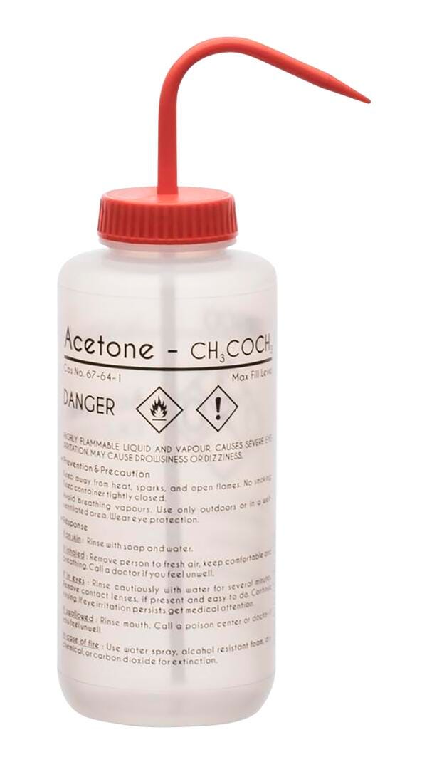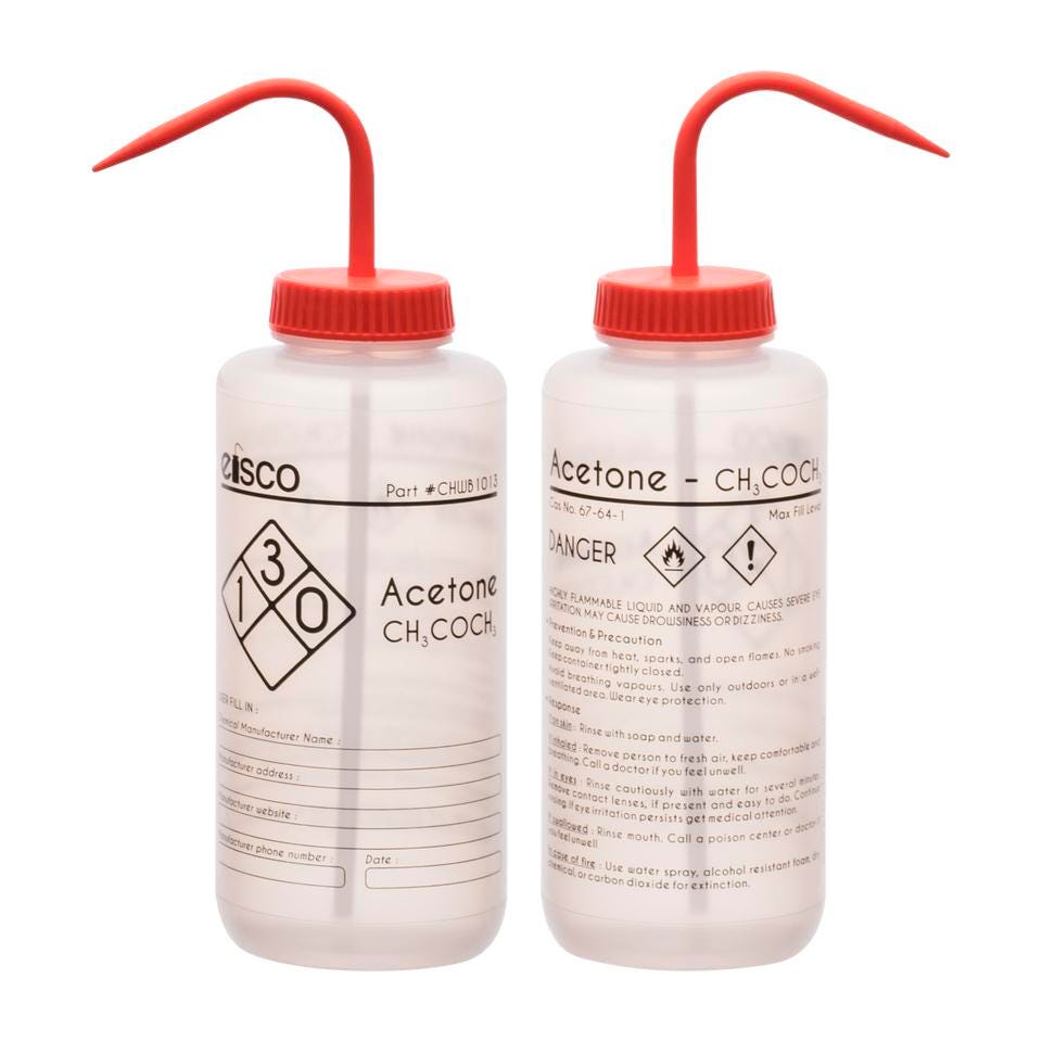 Eisco Labs 1000 milliliter acetone wash bottle is made with Eisco Labs exclusive Performance Plastic. Made of low-density polyethylene (LDPE) for superior quality, strength. Innovative Flex Ink won't fade, crack or peel.