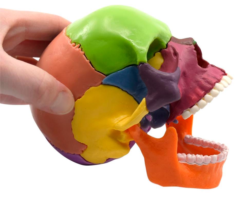 This didactic exploded mini skull model of a human provides an incredible amount of realism and detail for examining the human skeleton. Each of the 15 multicolored pieces in this educational puzzle features realistic textures and bony landmarks, making it an excellent tool for students. Magnetic mounting allows for sturdy assembly. When fully assembled, the skull measures 5 1/4 inches long, 3 inches wide and 4 inches tall.