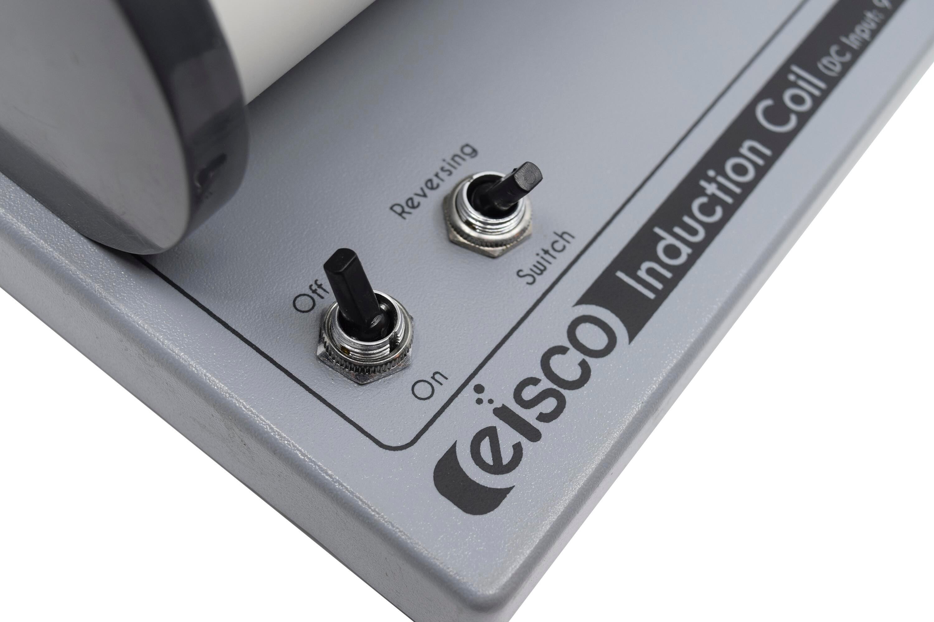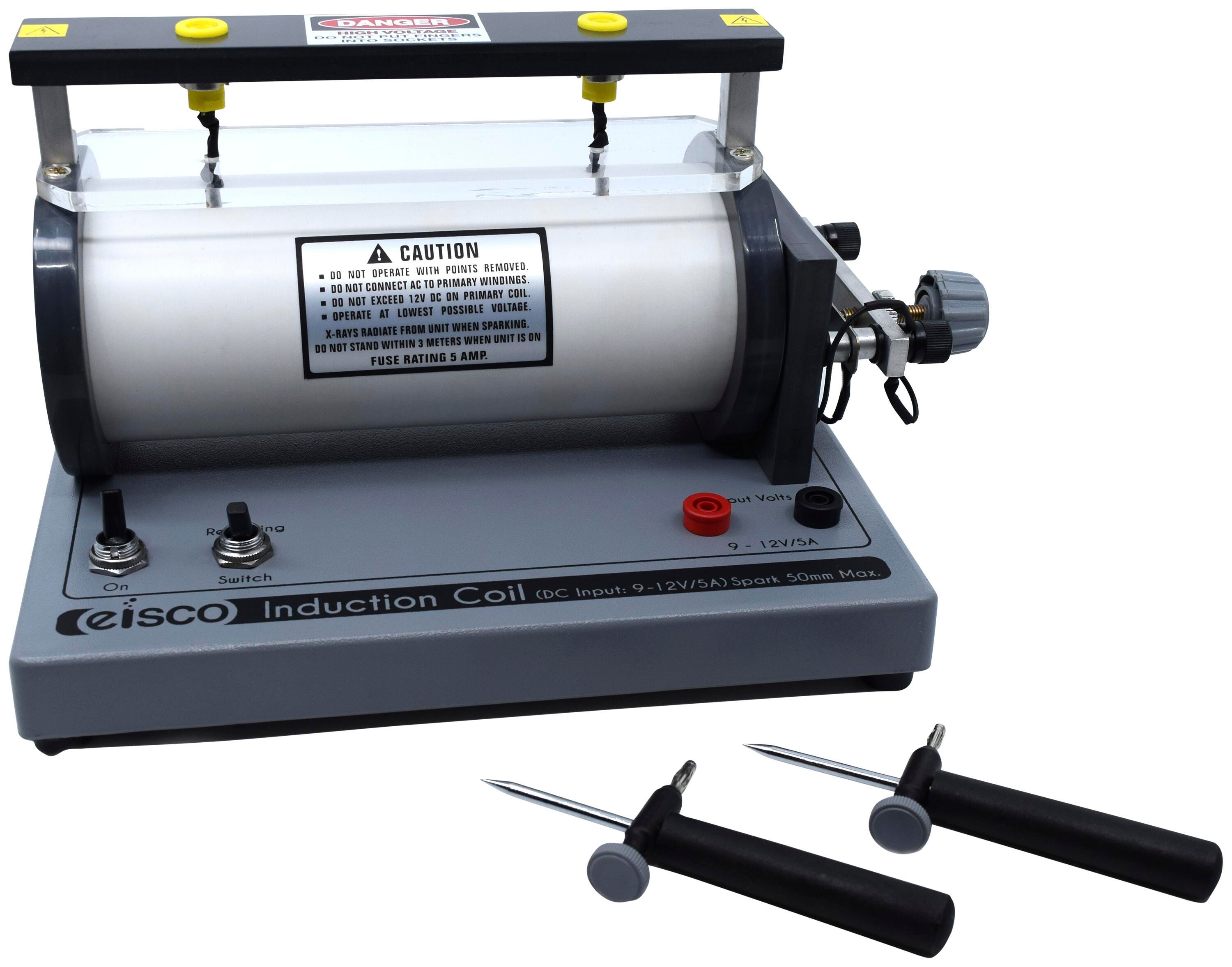 The induction coil provides very high voltages (several tens of thousands of volts) from a DC source. The principle is based on a step-up transformer comprised of a primary winding, a few tens of turns, and a secondary winding, hundreds of thousands of turns. To produce permanent sparks, it is necessary to cut the current flowing in the primary winding with a shaker (electromagnetic bell). The induction coil stands 6 inch tall, 11-1/2 inches wide, and 7 inches long. Each spark rod measures 5-1/4 inches long and 2-1/4 inches wide.