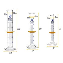 Three piece Measuring Cylinder set made of high quality, heavy duty, borosilicate 3-3/10 glass. 10, 25 and 50 milliliter capacities. Each cylinder features a spout for easy pouring, and hexagonal base for extra stability. Class A tolerance, per ISO/ASTM. All are fitted with a plastic, hexagonal protective collar. Set is packaged in a custom fit, thick foam casing, for safe storage and worry free transport.