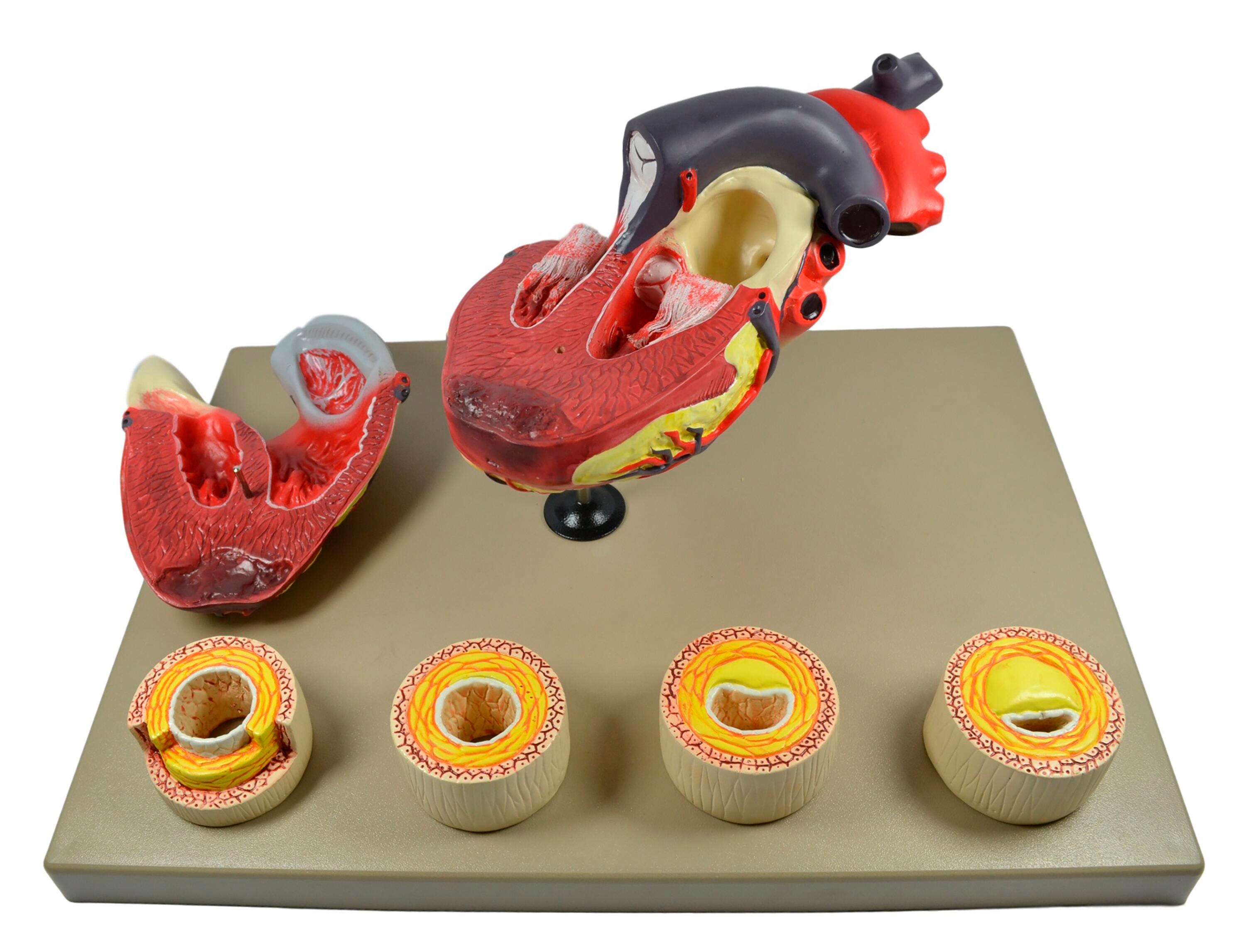 The detailed 3D rendering of the larger than life size human heart and arteries depicting heart pathologies, with its vibrantly colored anatomy, is ideal for studying the structure, function, and various pathologies of the human heart. Key pathologies are colored and numbered for comparison with the anatomy key that is included. The heart itself can be removed from the base and it can be separated into two pieces for further exploration of the anatomy and pathologies inside. This model provides a visually and kinesthetically effective method for studying the structure, function, and various pathologies of the human heart and arteries (myocardial infarction, atherosclerosis, and cardiomyopathy).Features